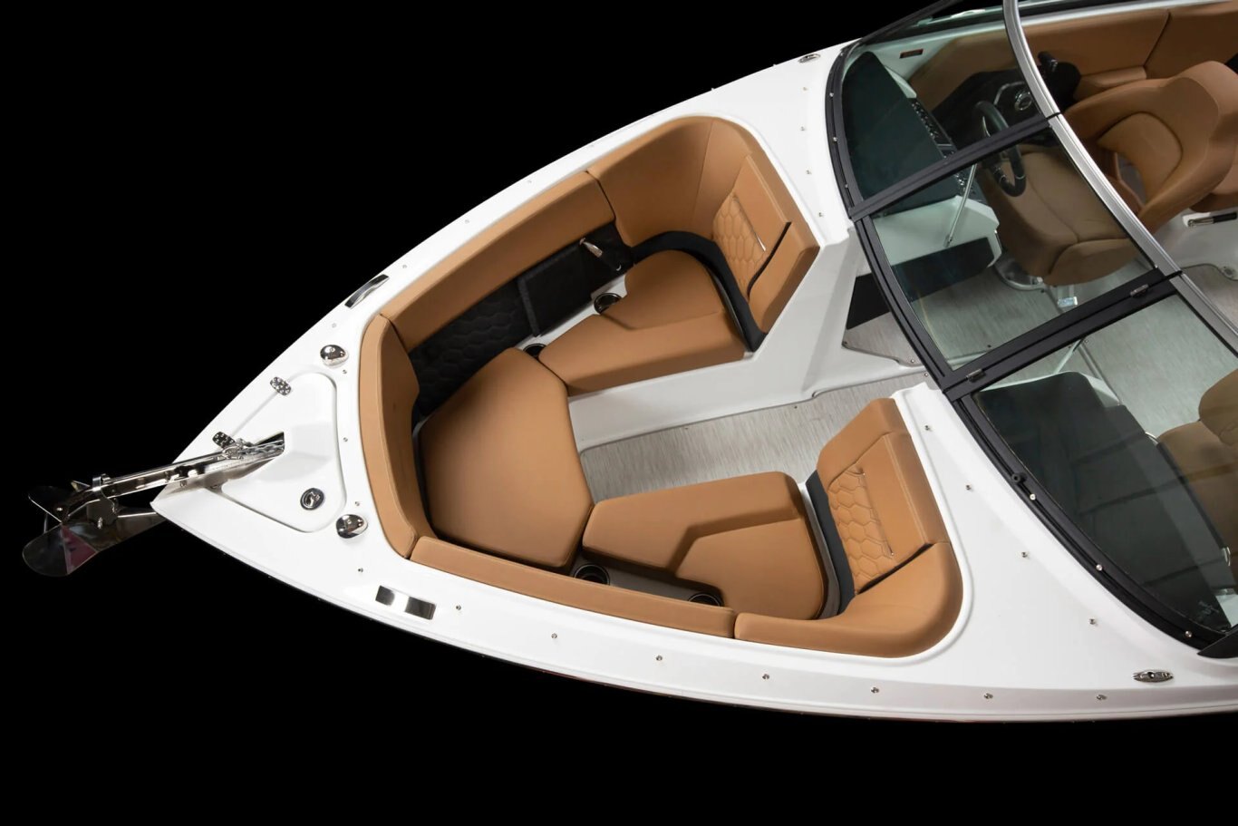• Windshield w/walk-thru, full-height, curved glass, exclusive design