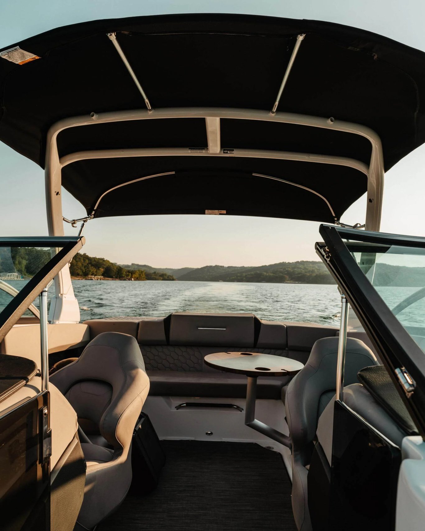 • Windshield w/walk-thru, full-height, curved glass, exclusive design