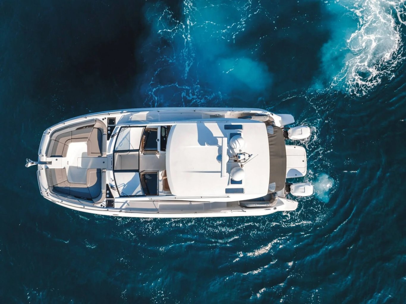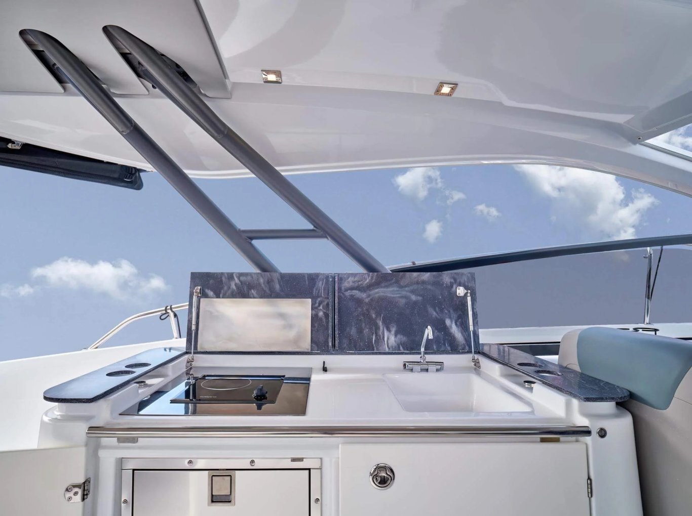 The spacious open-air wheelhouse provides a port-side double seat with a captain chair on the starboard side. The central galley area includes spacious storage and a modern style kitchenette with a sink, cooktop, and refrigerator with the options for dual refrigerators and a grill.