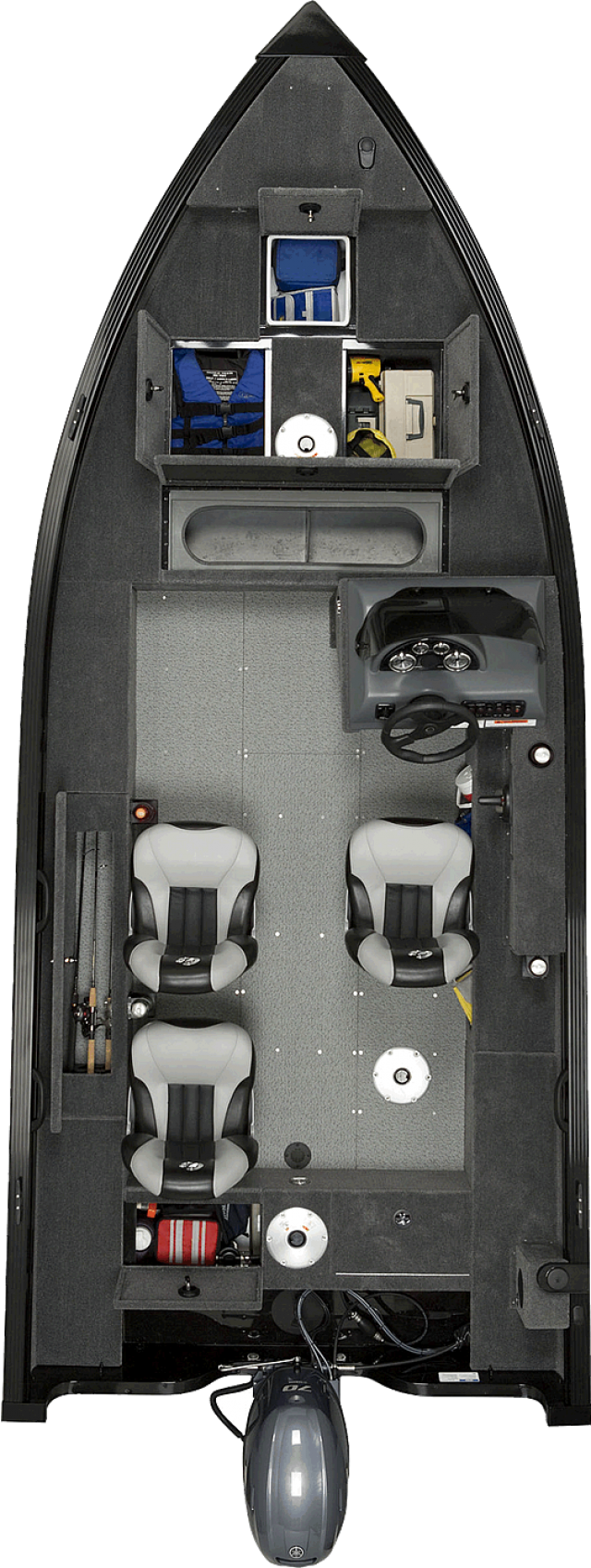 Riveted two-piece, .080 gauge hull with GX2 double-plated bow ♦ Fully painted urethane high-gloss color with custom graphics ♦ Precision fit, powder-coated 3” tubular steel Trail Guard® trailer with locking detachable tongue, space saving and security ♦ 13” radial tires, tongue jack and windguides