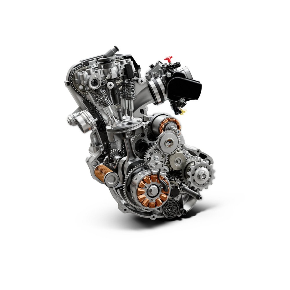 The MC 250F loves to be revved, which is all possible thanks to the DOHC cylinder head that features large titanium valves and finger followers with a tough Diamond Like Carbon (DLC). The result is minimal friction and optimal performance. The carefully designed combustion chamber produces efficient, high-level power across the entire rev range with the motor also fitted with a multifunctional balancer shaft, which drives the coolant pump and the timing chain. |