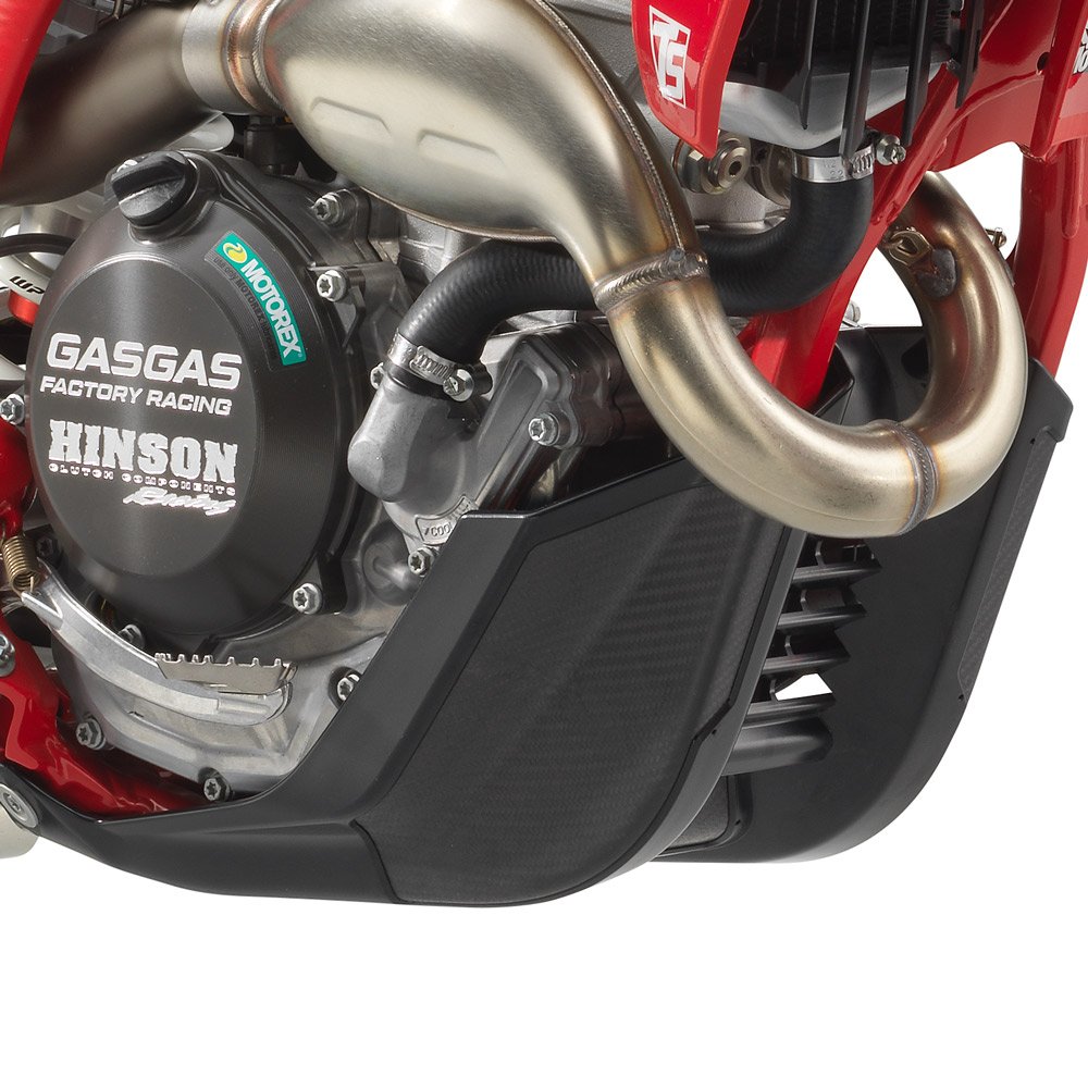 Fitting neatly around the underside of the 450cc motor, the Factory Racing Skid Plate offers incredible protection from rocks, roost, and will stop just about anything from damaging the motor out on the track. This carbon-reinforced engine shield extends around both sides of the motor, the clutch and ignition covers are well protected too. |
