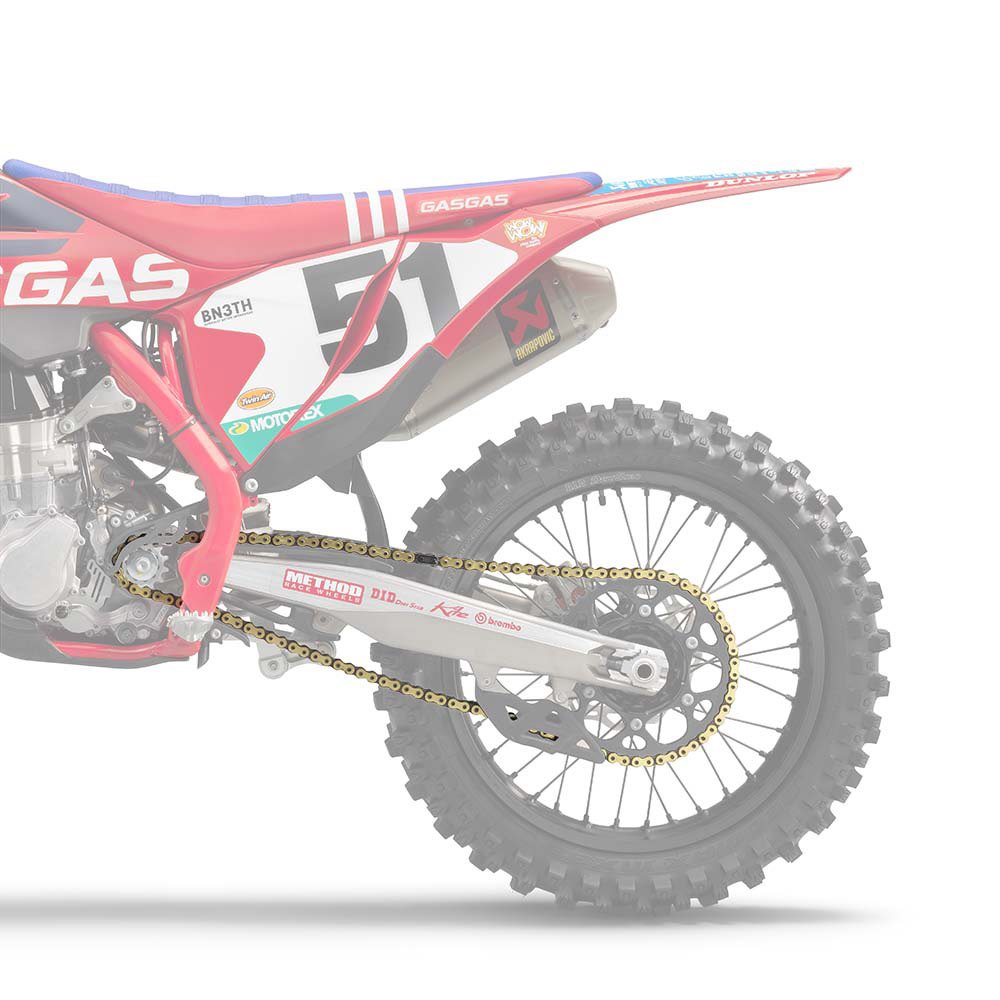 Another race team replica bike must-have is a gold chain, which really stands out against the black Rear Sprocket. The race-proven X-Ring chain ensures relaibilty and strength, keeping you in the race for the podium.