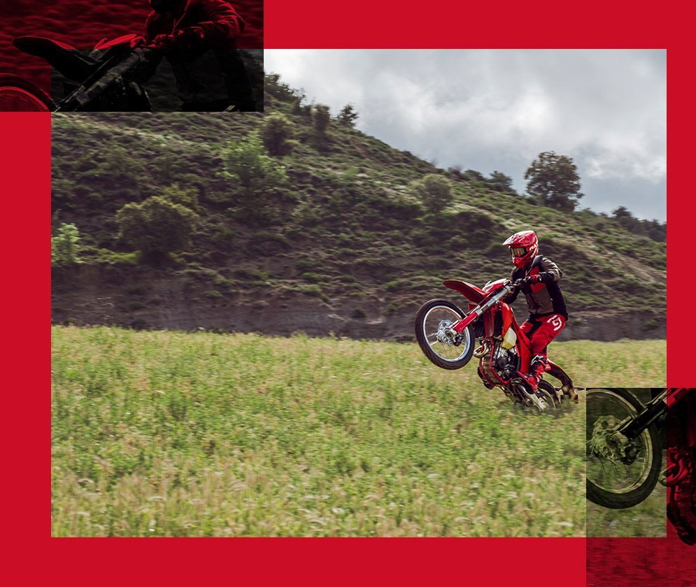 All red, front to back! Just the way a GASGAS should be. Incredibly ergonomic with large contact surfaces to help you grip the bike with your legs, the smooth profile bodywork encourages riders to move around and ride with a perfect technique. There's also a super grippy seat cover to keep you locked in place, which works just as well when the rain starts falling and the going gets gnarly!
