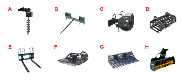 A Augers B Bale Movers C Brooms D Grapples E Pallet Forks F Mower, Rotary G Skeleton Rock Bucket H Snow Removal