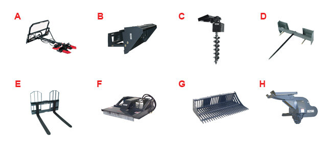 A Tree Shears B High Dump Bucket C Augers D Bale Movers E Pallet Forks F Mower, Rotary G Skeleton Rock Bucket H Stump Grinders