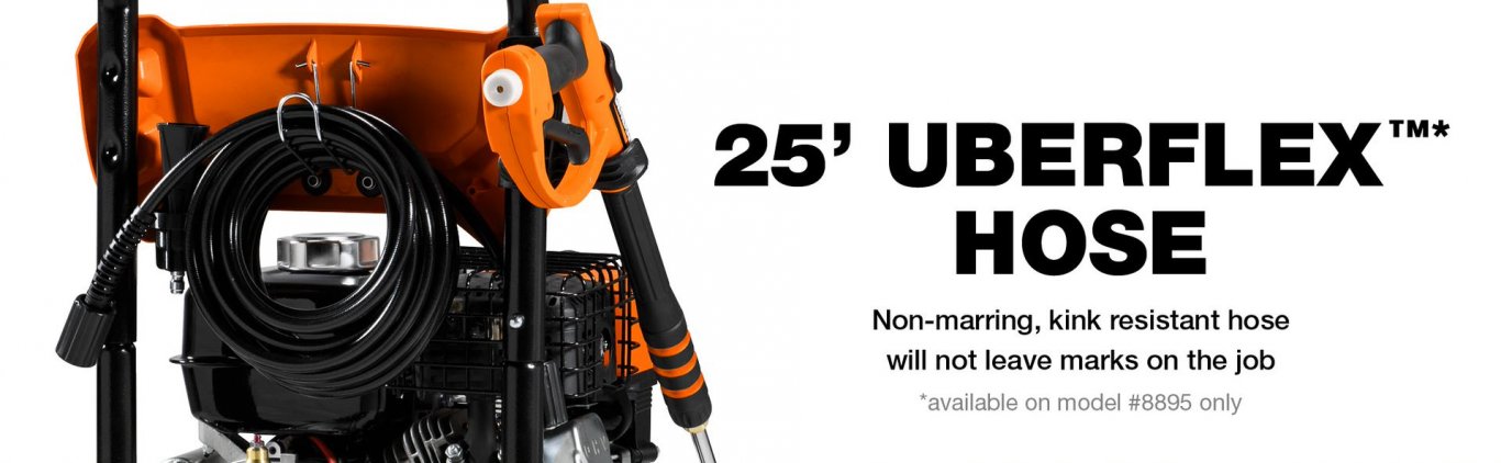 Electric start one touch push start provides reliable, hassle-free startups Powerful Horizontal Generac OHV Engine – Delivers up to 4x longer engine life* and 3x longer run time** than vertical shaft engines Lithium-ion battery and charger included (battery will provide up to 50 starts) PowerDial™ gun allows you to easily adjust the pressure needed between four different tasks - car, wood, concrete and soap - at your fingertips Power Broom attachment included! The Power Broom is equipped with high pressure nozzles to clean 4X faster than standard nozzles Soap Blaster attachment included! Soap Blaster attachment sprays soap 3X farther than a standard nozzle tip to penetrate tough stains and improve cleaning results 25 foot UberFlex™ hose, most flexible hose in the industry; kink resistant, non-marring Horizontal axial cam pump allows for easy access hose connections Never-flat wheels provide easy transport on rugged terrain and up stairs Includes 4 quick-change nozzle tips: 0°, 25°, 40° and soap On-board detergent tank for added convenience *Generac horizontal shaft engines expected life/emissions rating of 500 hours vs average small vertical shaft engine life/emissions rating of 125 hours **Based on 3.2qt fuel tank size vs average small vertical shaft engine 1.2qt fuel tank size |