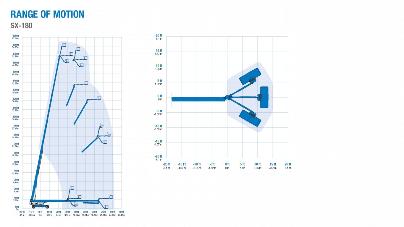 Tackles the most extreme jobs with a vertical reach of 180 ft (54.9 m) and horizontal reach of 80 ft (24.4 m)