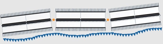 Still the Most Flexible DraperGeringhoff drapers are still the most flexible drapers on the market with a three-section flex-point frame and reel that can flex 4° up and 5° down, the TruFlex Razor provides a total range of 9° of flex. It also features a flexible cutterbar with 15,24 cm of ground contouring travel. The result is an outstanding draper that adapts and minimizes losses in all harvesting conditions. |