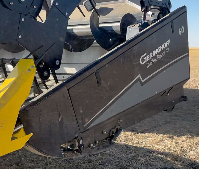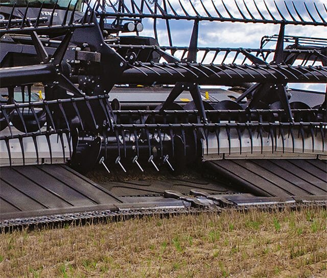 Maximum Flex for Razor-Close HarvestingThe TruFlex Razor design provides the most flexible, ground following characteristics of any draper available today. Unmatched when harvesting on uneven terrain. Simple adjustments allow you to switch to rigid mode on the frame, the cutter bar or any combination of the two. The TruFlex Razor draper with Integrated Air System raises the bar using a flexible frame, flexible cutter bar and flexible reel. The IAS delivers a steady stream of air at the cutter bar which gently carries the cut crop to the draper belt. The minimal distance from cutter bar to draper belt makes this an easy transition capturing more of your hard-earned crop. |