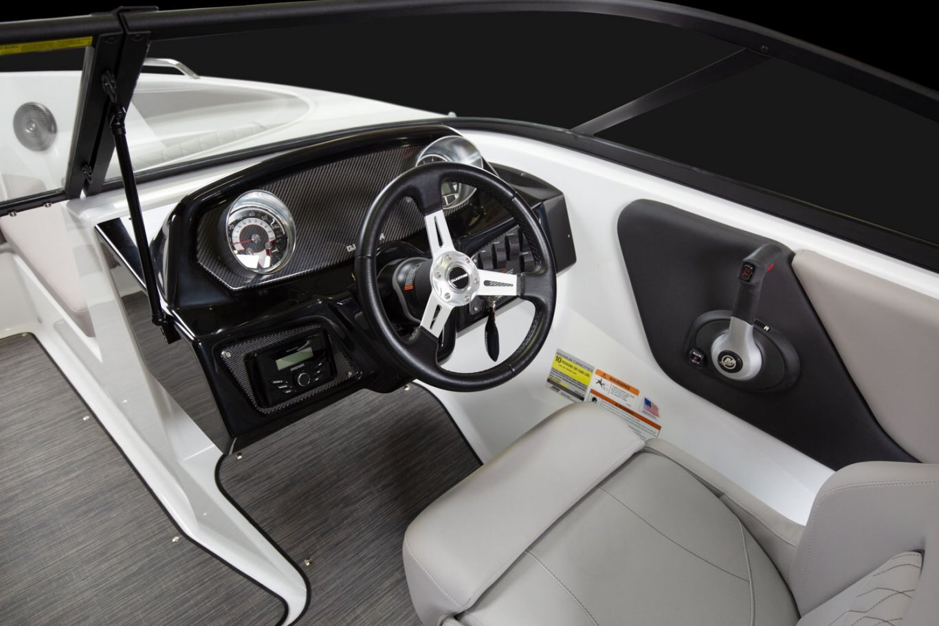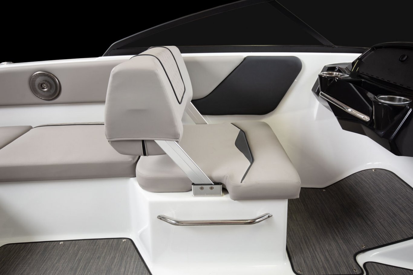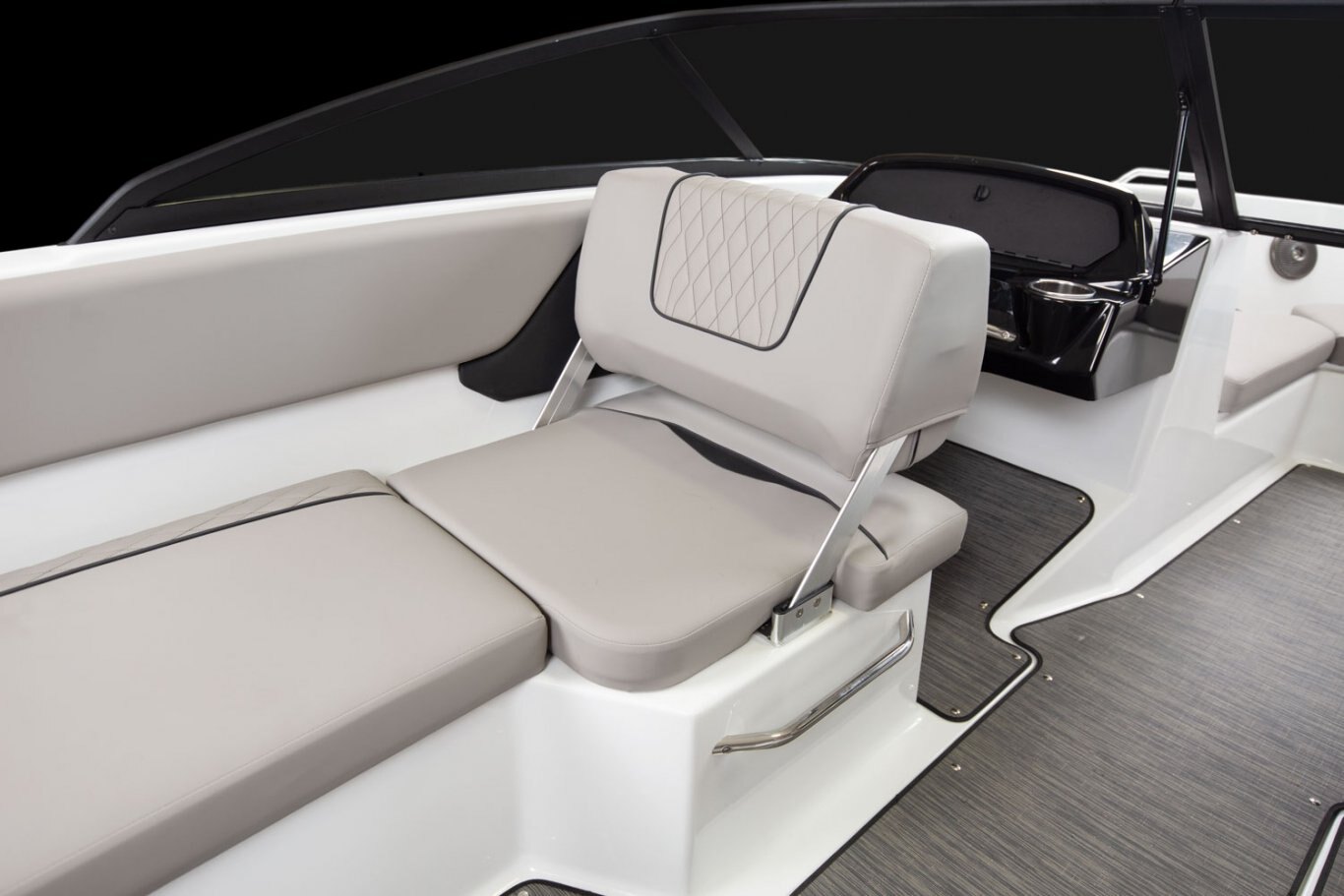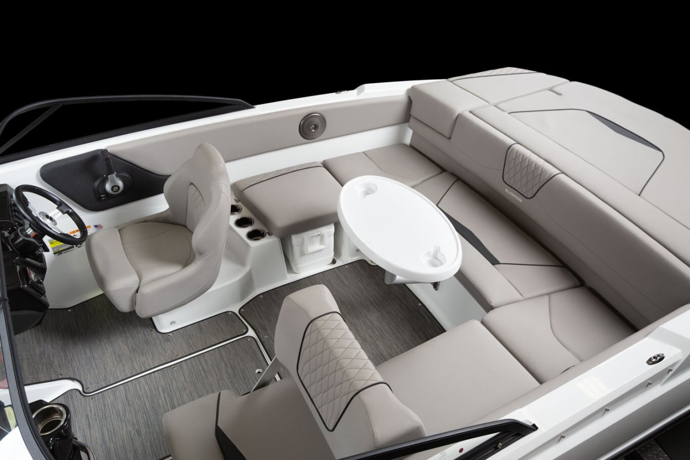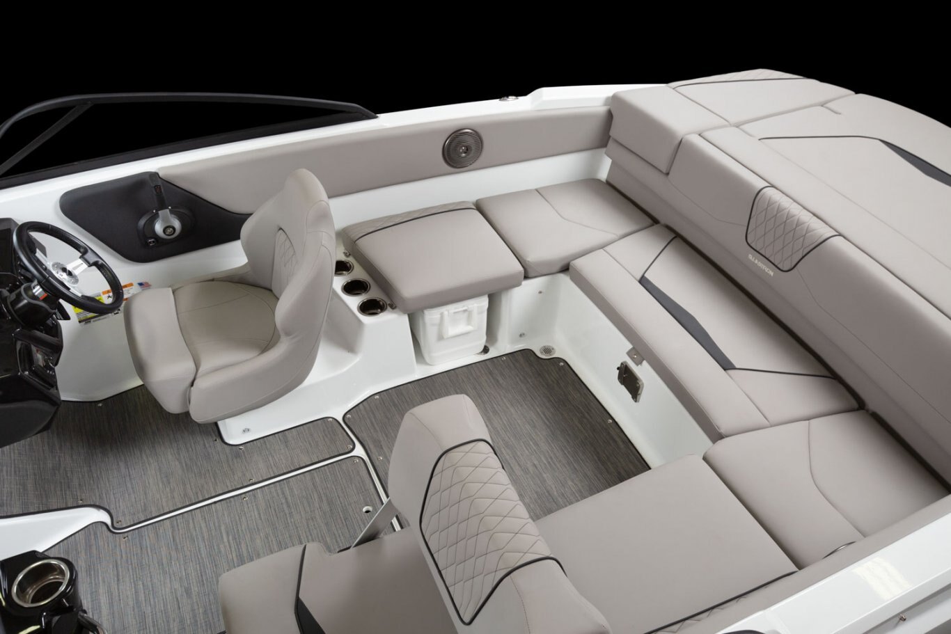 A classic look all the way around. Exceptionally crafted upholstery offers comfort and style, as does the sleek wrap-around windshield and new helm design. U-shaped cockpit seating, adjustable helm seats, and a large sun pad guarantees everyone has a comfortable spot.