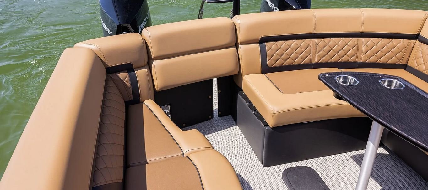 Kick back, relax and enjoy the comfortable Ultra-Lounge, Dual Flip Lounge, Single Flip Lounge seating on one of our AquaPatio Lounge models. Whether you're enjoying a sunrise brunch or sunset cruise, you'll enjoy every second on the water with our convenient stern table.