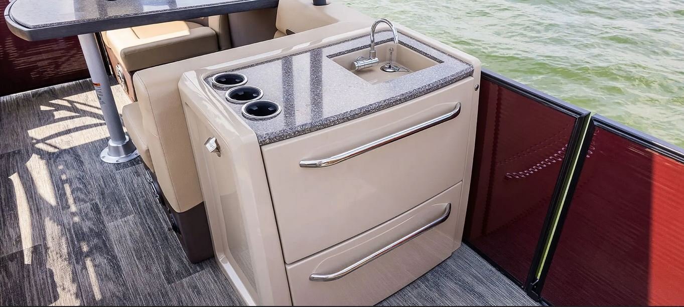 Entertain your favorite crowd aboard one of our AquaPatio SunDeck models. With optional Entertainment Center with sink with faucet and integrated lid, pull-out trash can, and many more amentites, yout day on the water will be more convenient than ever.