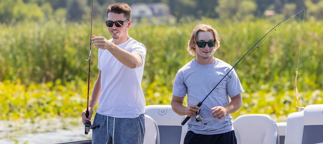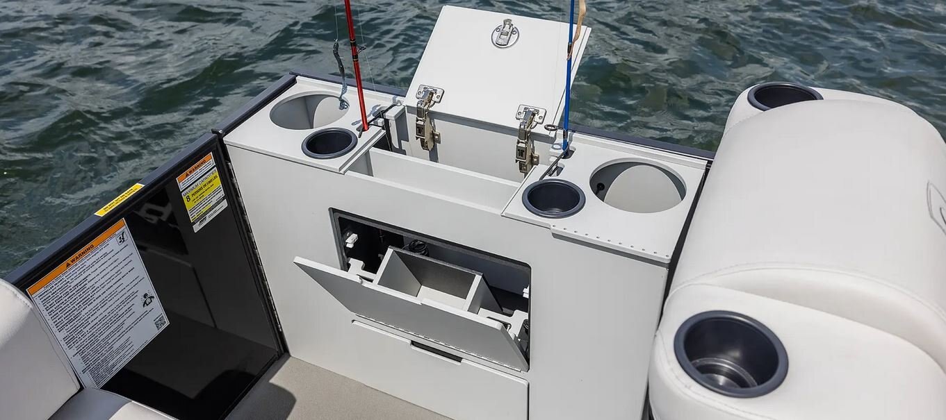 Mighty G Fishing models come standard with an aft fishing station with rod holders, tackle storage, and trolling motor ready with a motor harness kit, including a plug and half gate. For passengers, it is equipped with durable, yet comfortable bench-style seating, a telescoping EZ Climb Ladder and robust Clarion sound. Full 360-degree RGB under deck lighting is available, as well as an optional bimini for sun protection and a cell phone mount at the helm station.