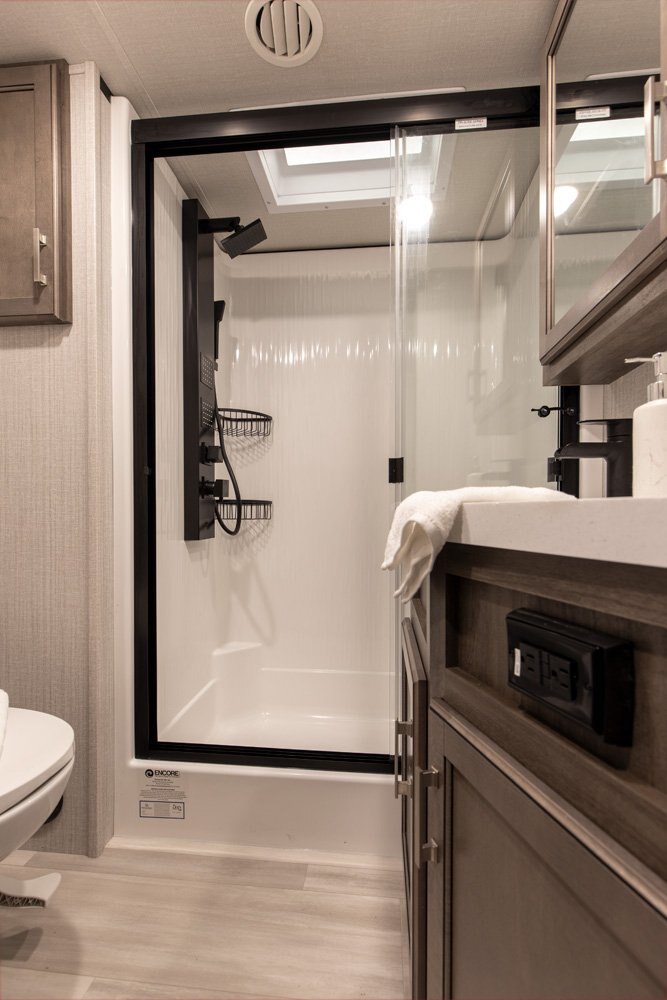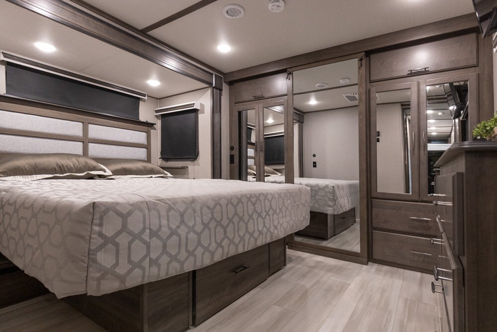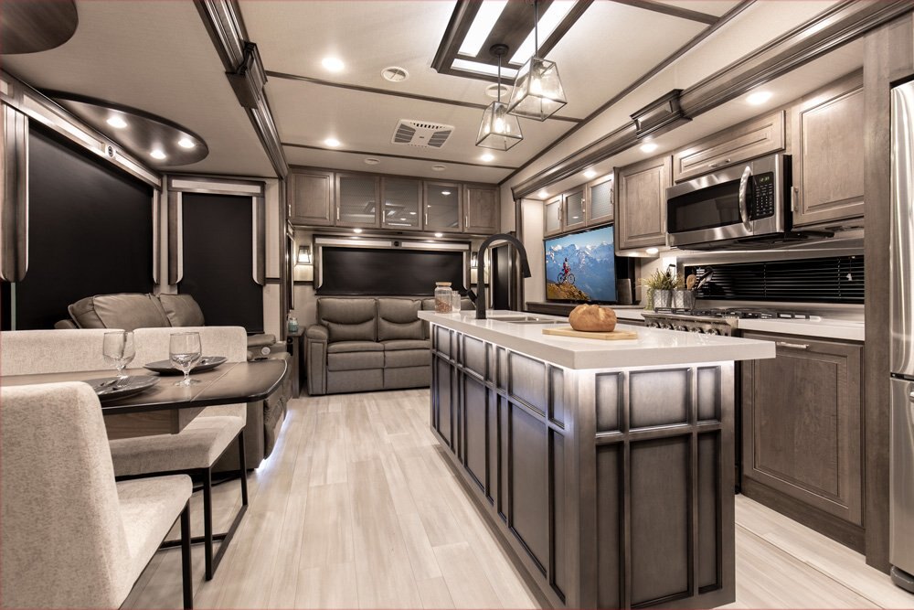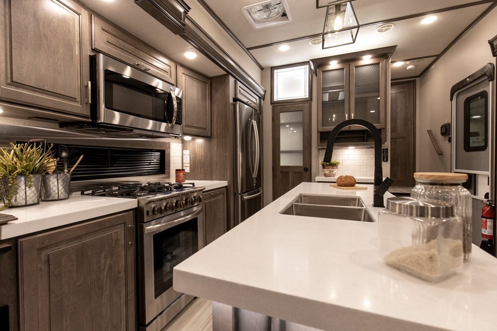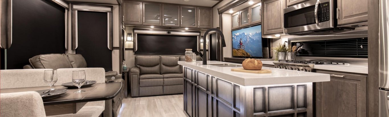 If more room is what you desire, Solitude is the most spacious Extended Stay Fifth Wheel ever built! The Solitude RV delivers taller ceilings, taller, deeper cabinets, larger scenic window areas, a full 6' 8" tall slideout, and a body width that measures a full 101 inches!