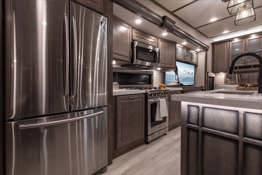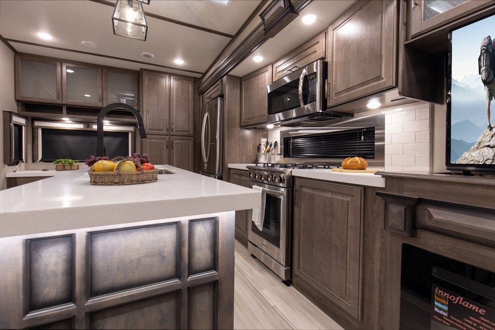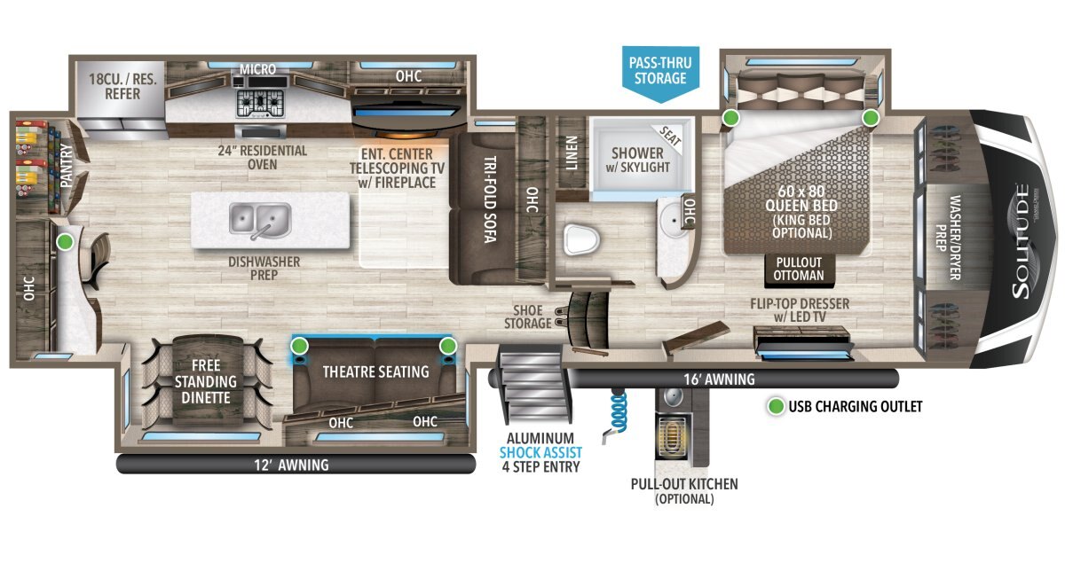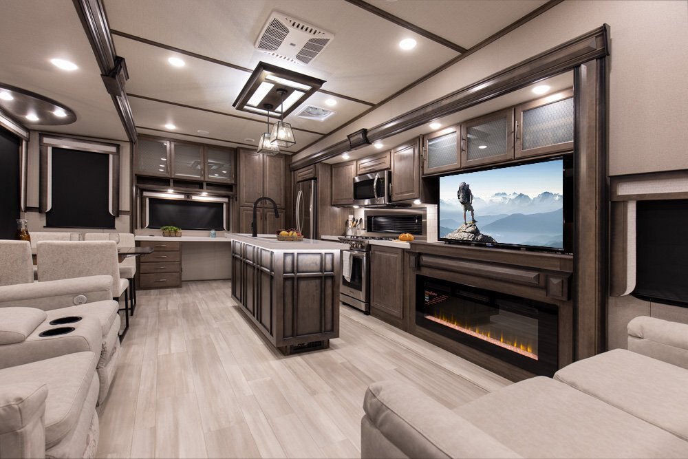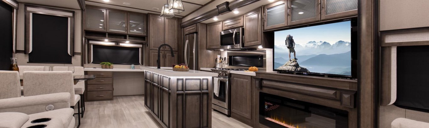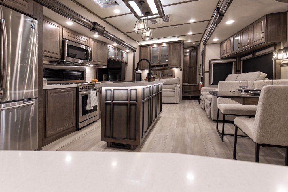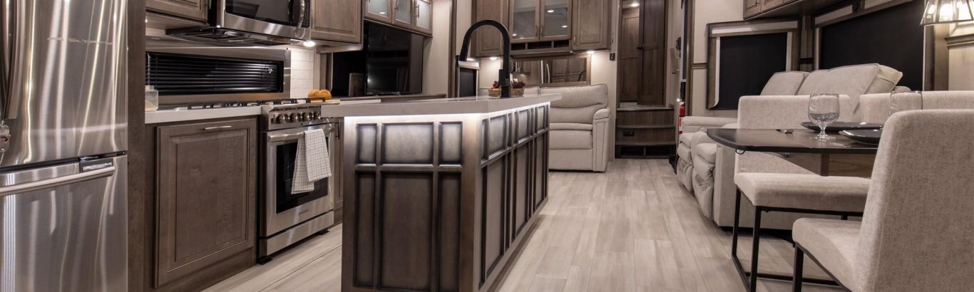 If more room is what you desire, Solitude is the most spacious Extended Stay Fifth Wheel ever built! The Solitude RV delivers taller ceilings, taller, deeper cabinets, larger scenic window areas, a full 6' 8" tall slideout, and a body width that measures a full 101 inches!