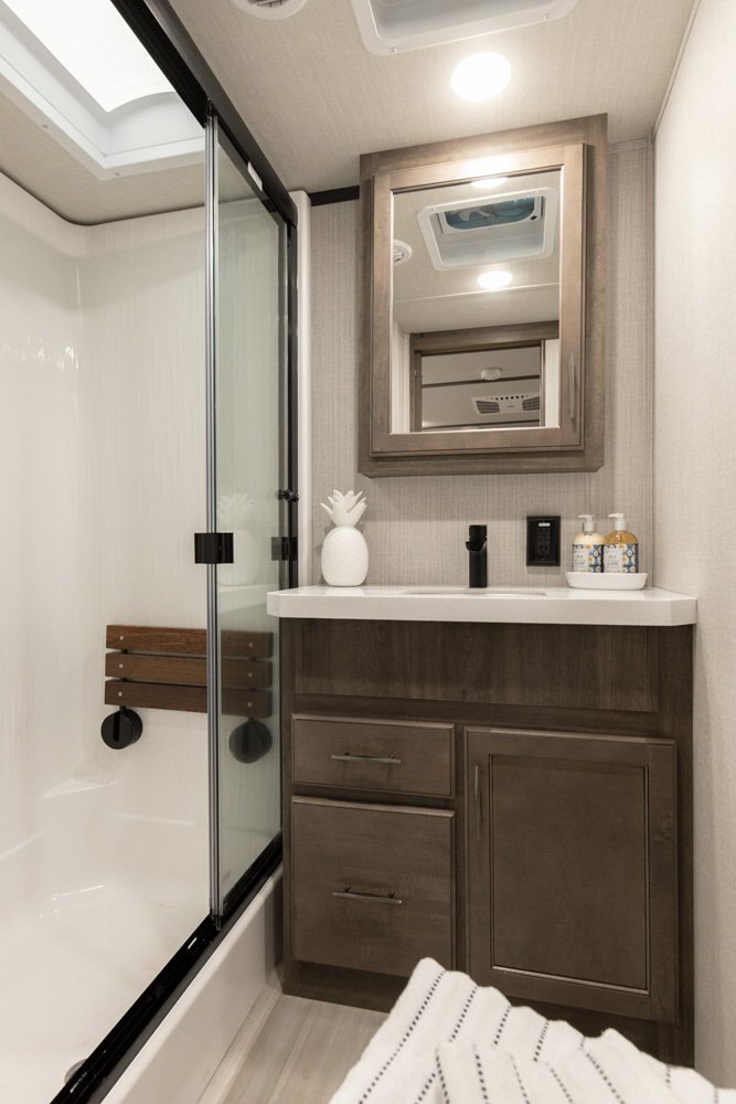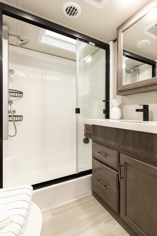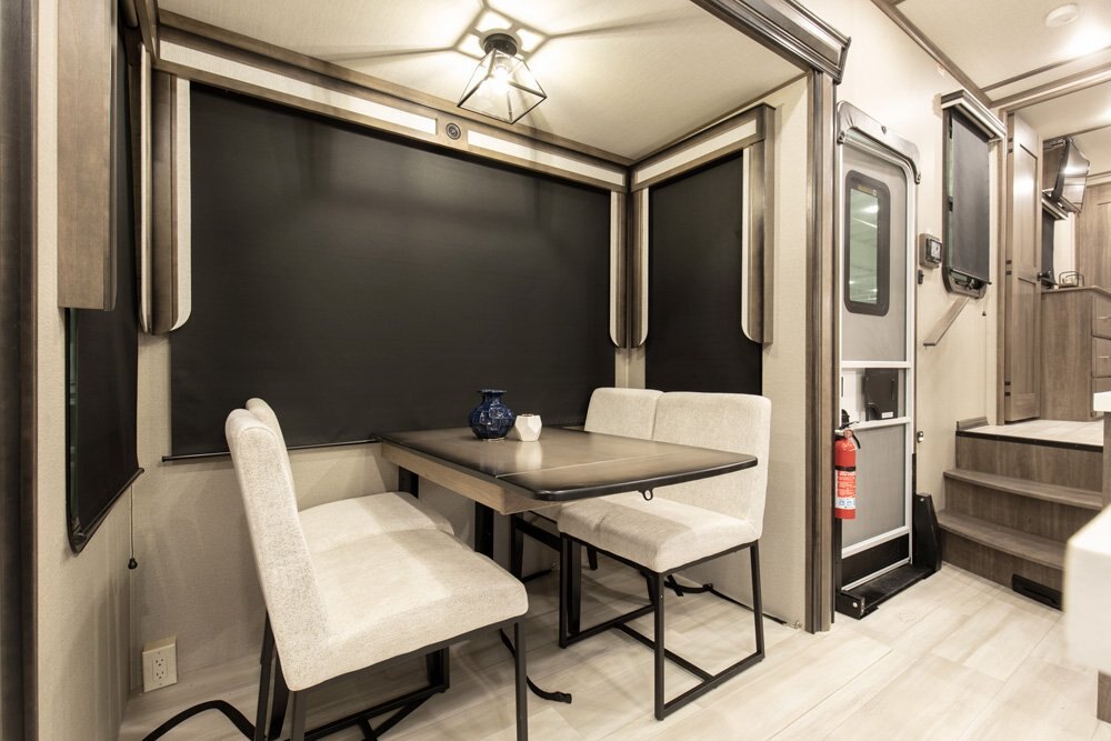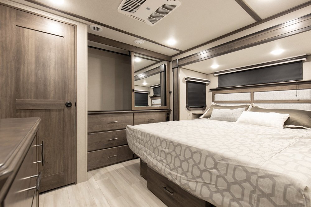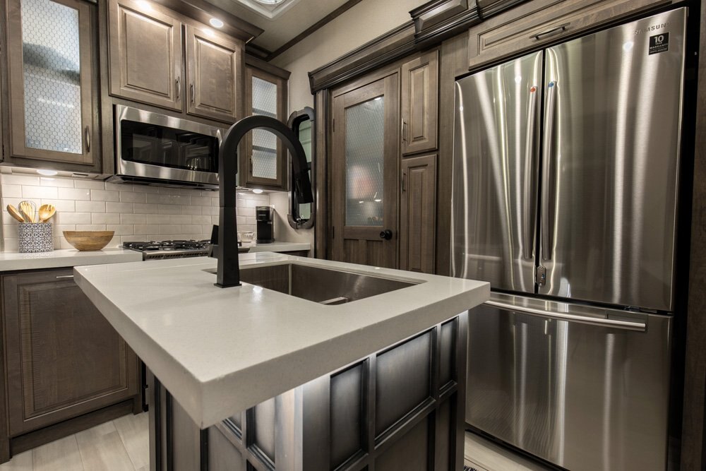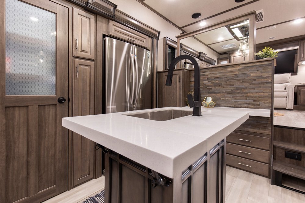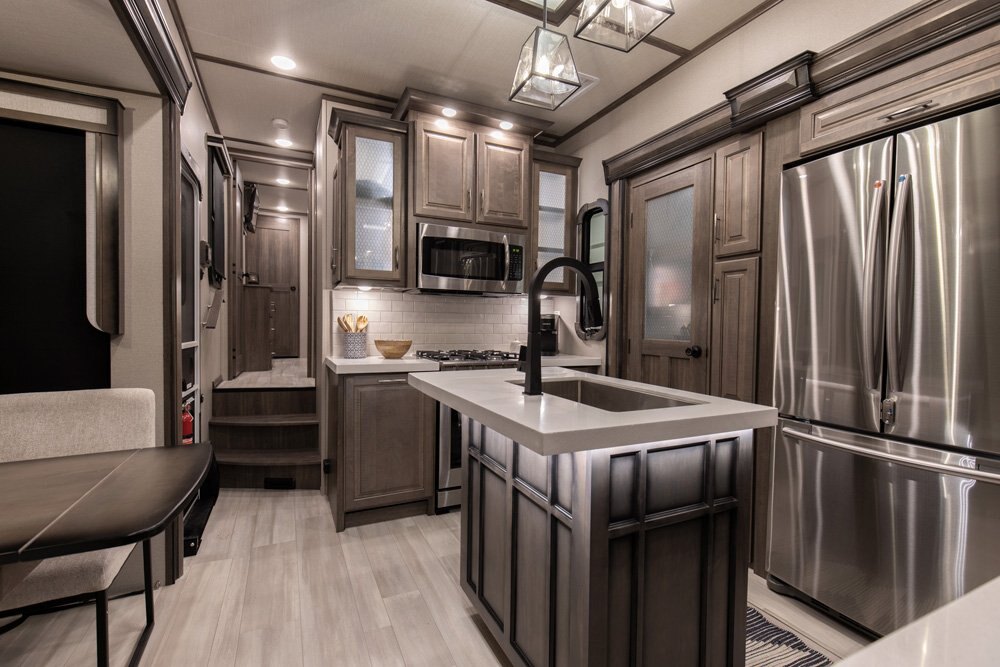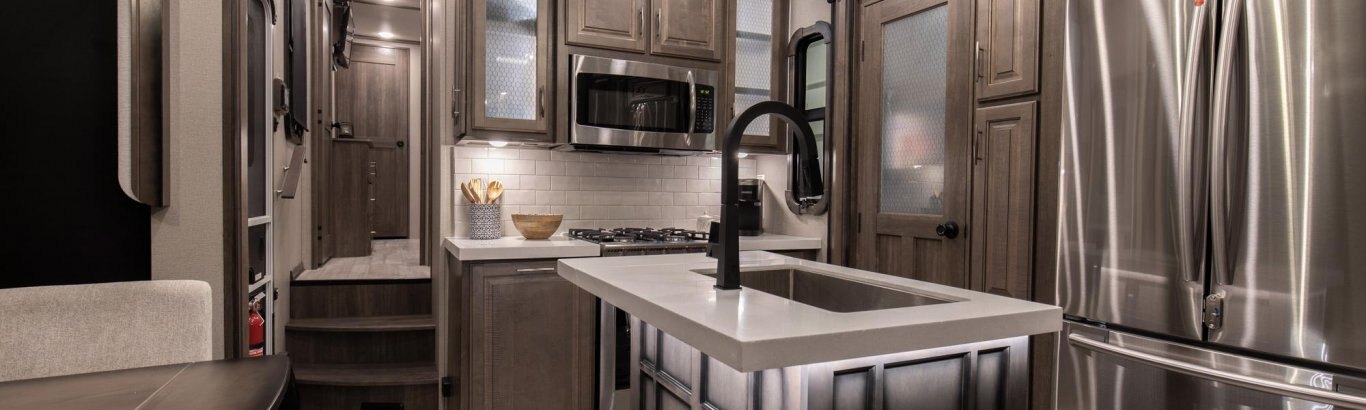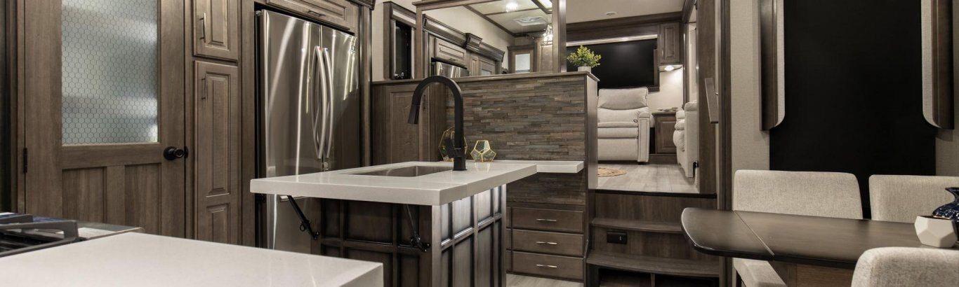 If more room is what you desire, Solitude is the most spacious Extended Stay Fifth Wheel ever built! The Solitude RV delivers taller ceilings, taller, deeper cabinets, larger scenic window areas, a full 6' 8" tall slideout, and a body width that measures a full 101 inches!