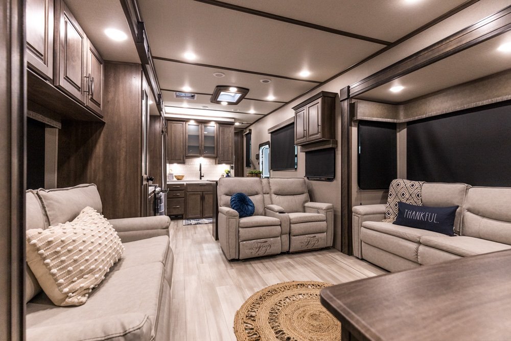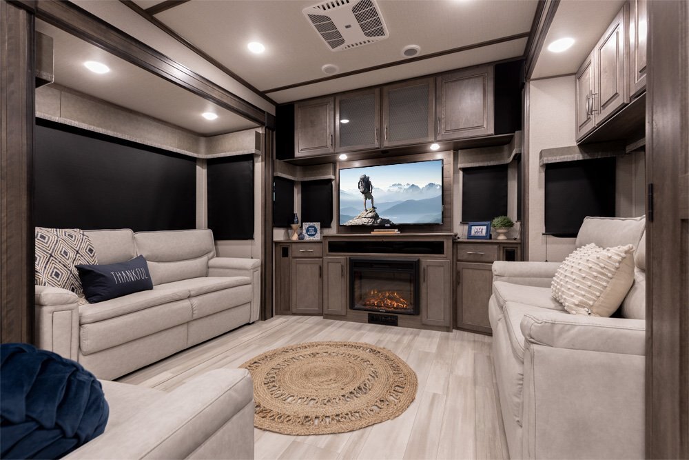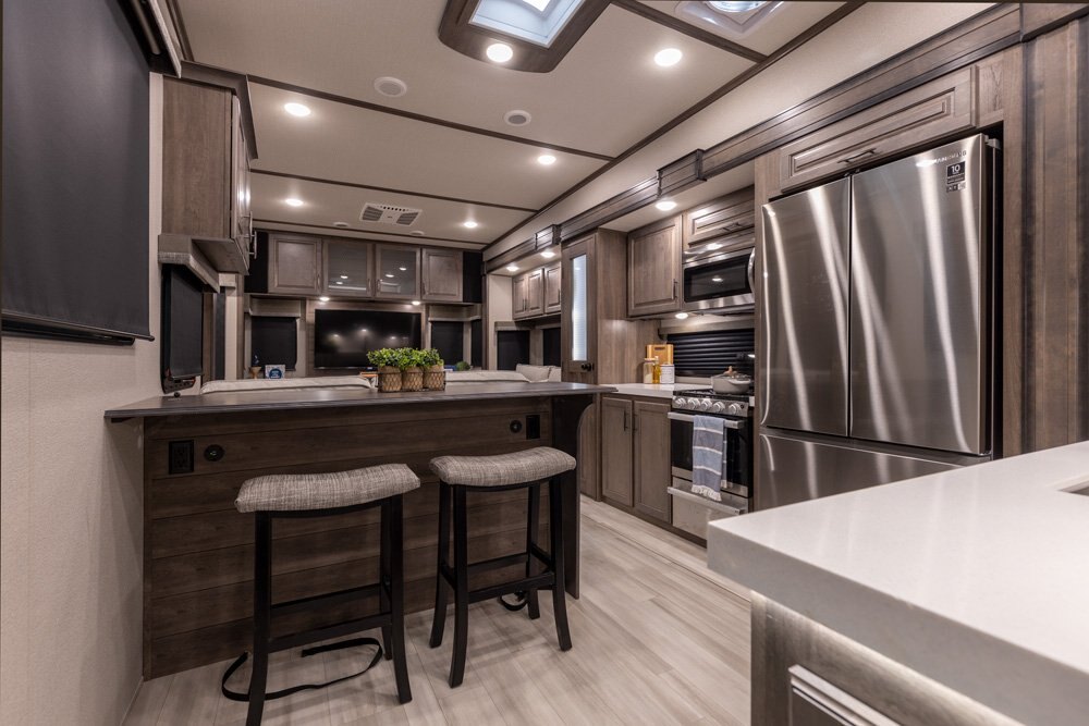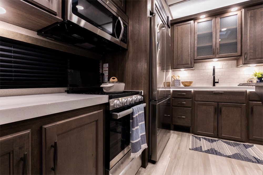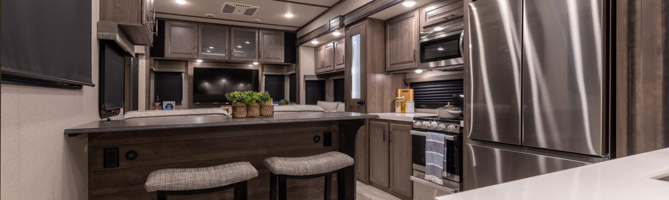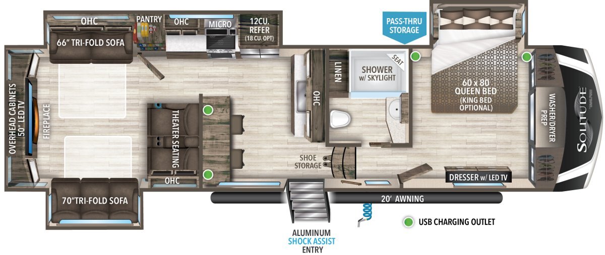 If more room is what you desire, Solitude is the most spacious Extended Stay Fifth Wheel ever built! The Solitude RV delivers taller ceilings, taller, deeper cabinets, larger scenic window areas, a full 6' 8" tall slideout, and a body width that measures a full 101 inches!