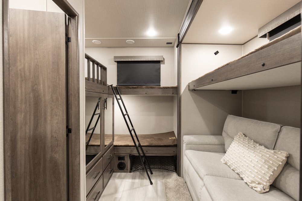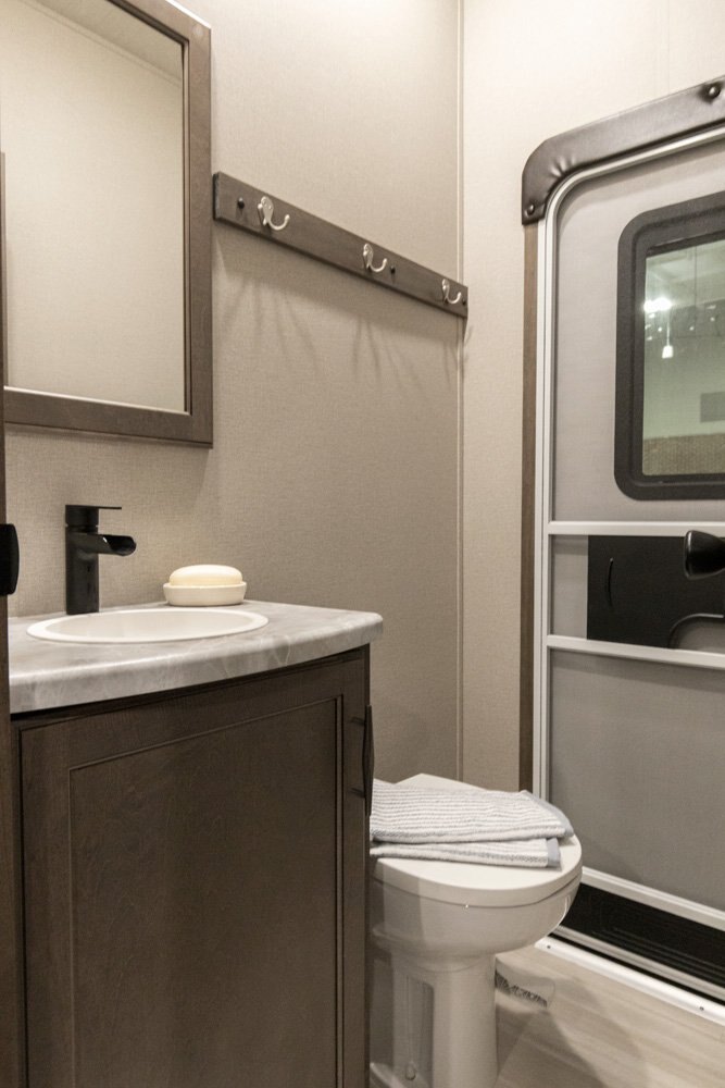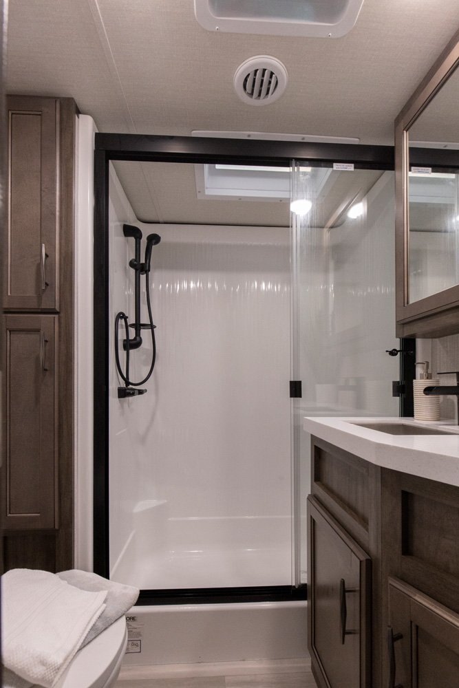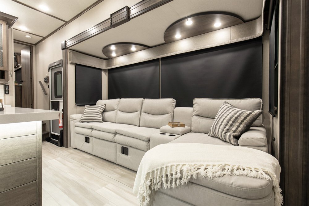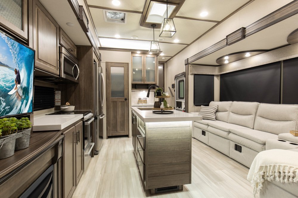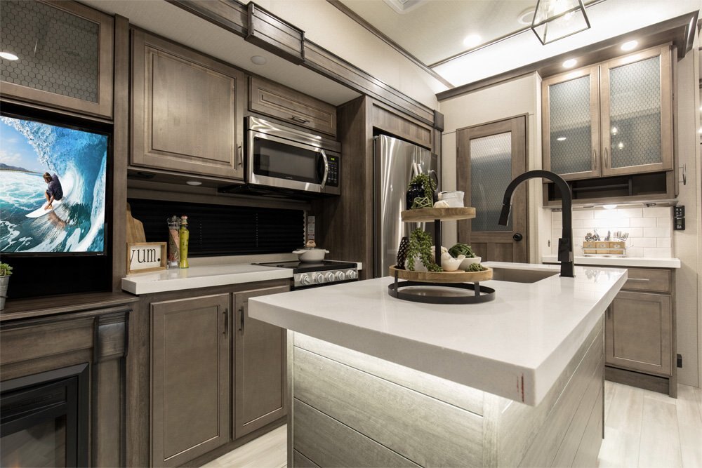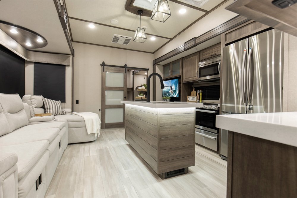 If more room is what you desire, Solitude is the most spacious Extended Stay Fifth Wheel ever built! The Solitude RV delivers taller ceilings, taller, deeper cabinets, larger scenic window areas, a full 6' 8" tall slideout, and a body width that measures a full 101 inches!