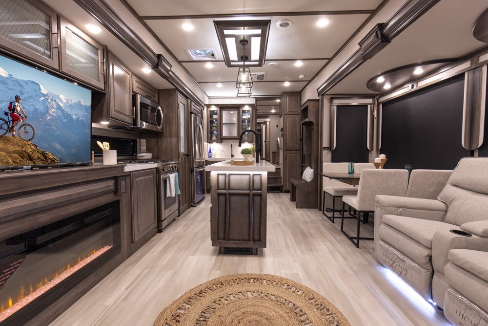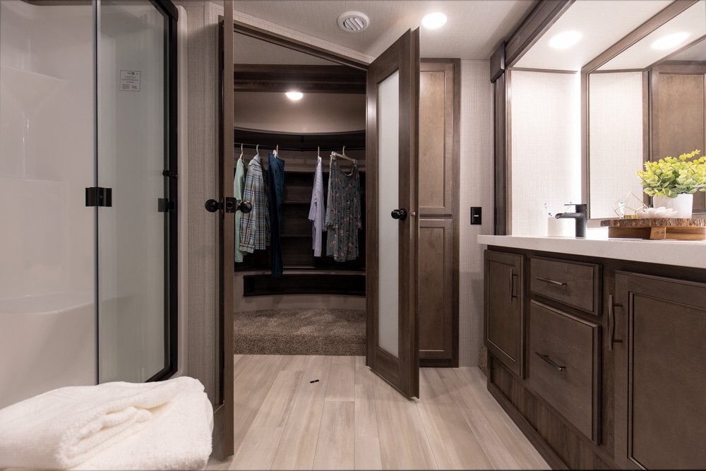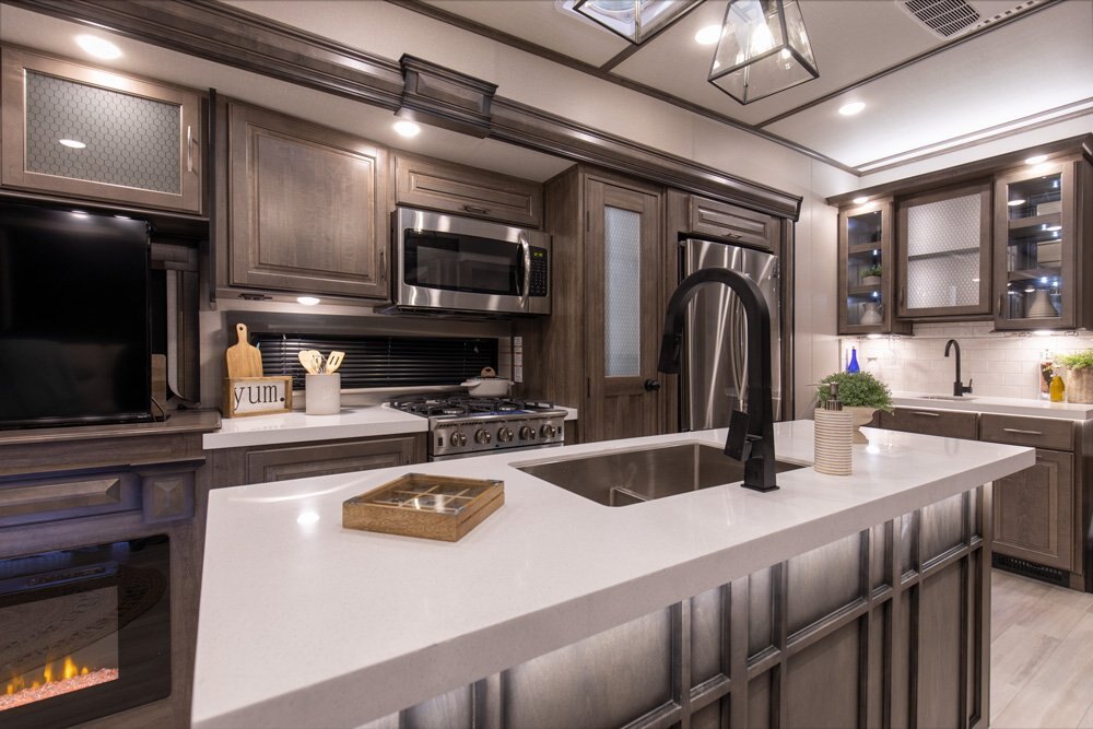If more room is what you desire, Solitude is the most spacious Extended Stay Fifth Wheel ever built! The Solitude RV delivers taller ceilings, taller, deeper cabinets, larger scenic window areas, a full 6' 8" tall slideout, and a body width that measures a full 101 inches!