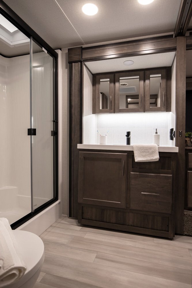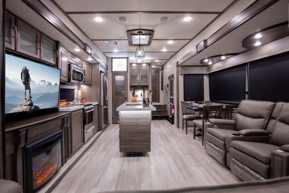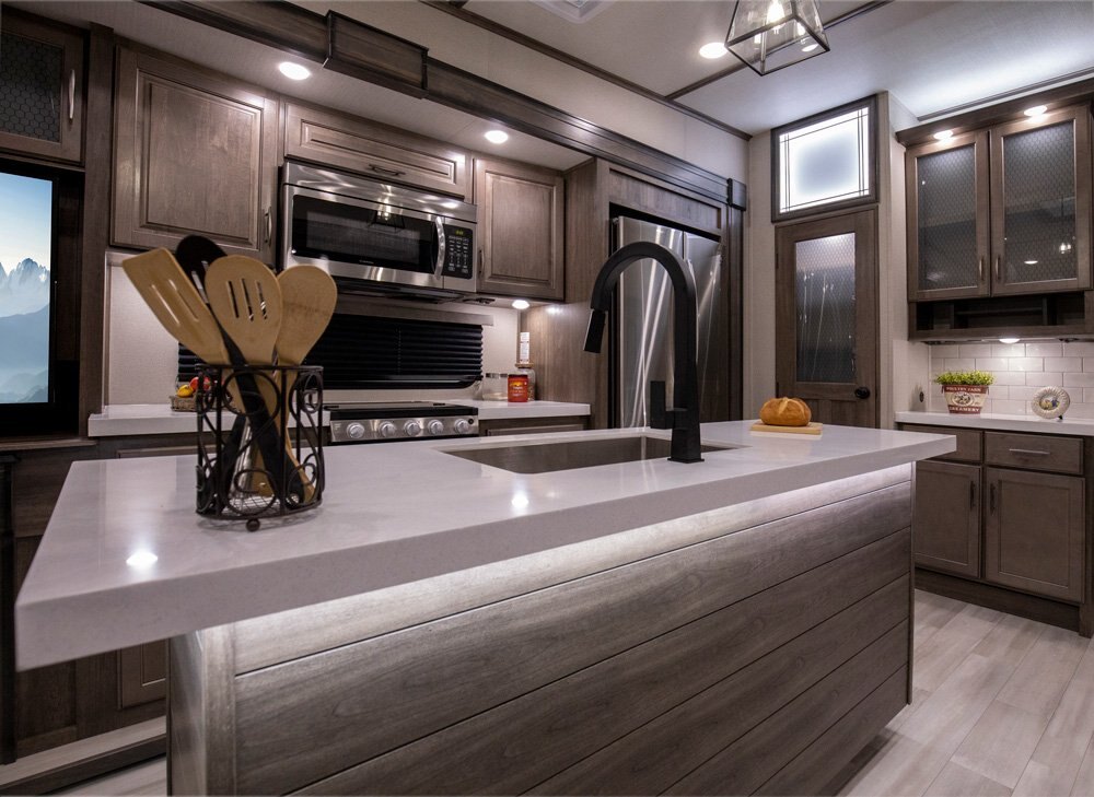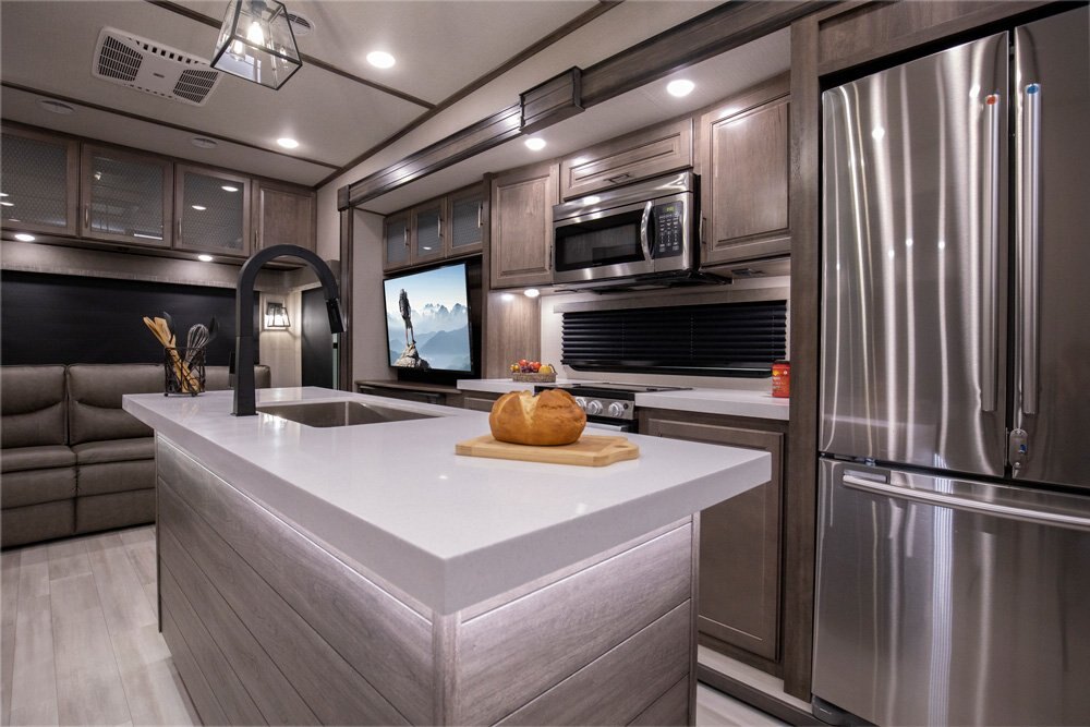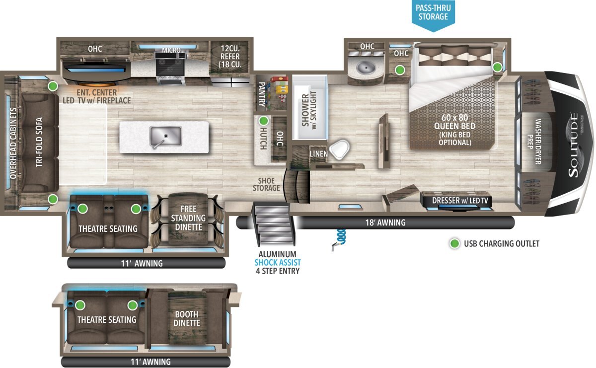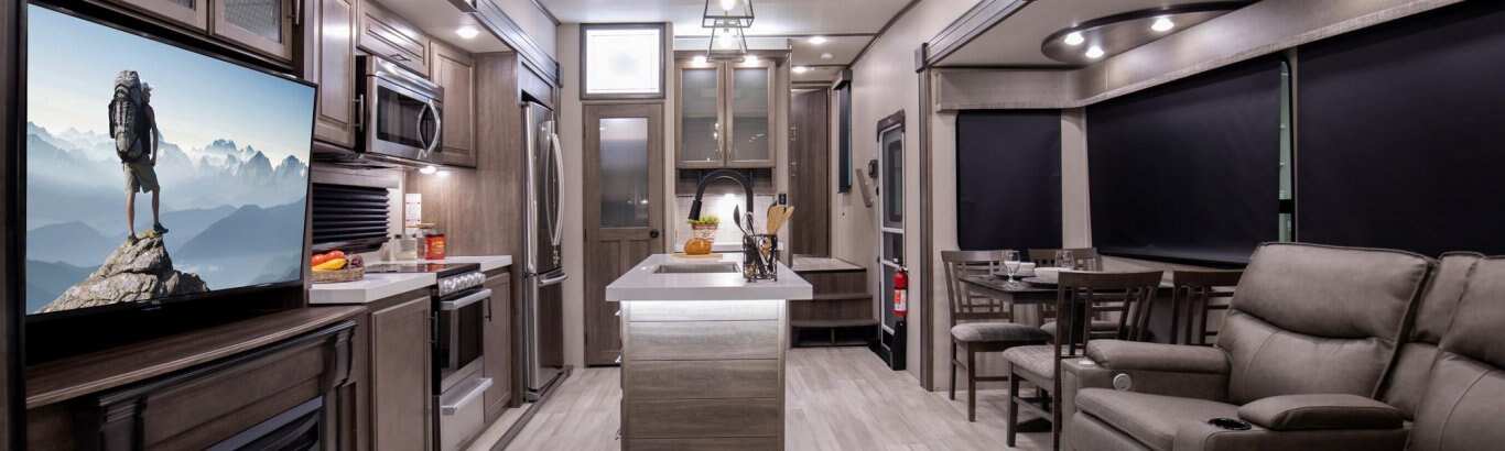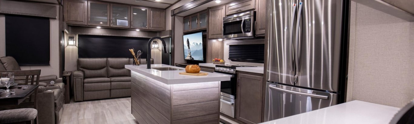If more room is what you desire, Solitude is the most spacious Extended Stay Fifth Wheel ever built! The Solitude RV delivers taller ceilings, taller, deeper cabinets, larger scenic window areas, a full 6' 8" tall slideout, and a body width that measures a full 101 inches!