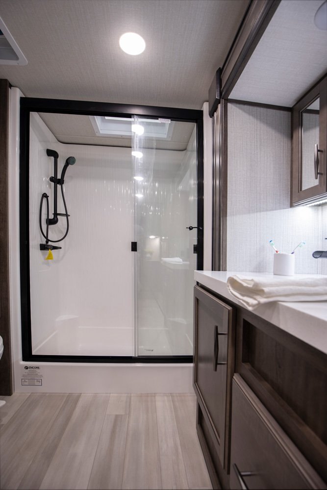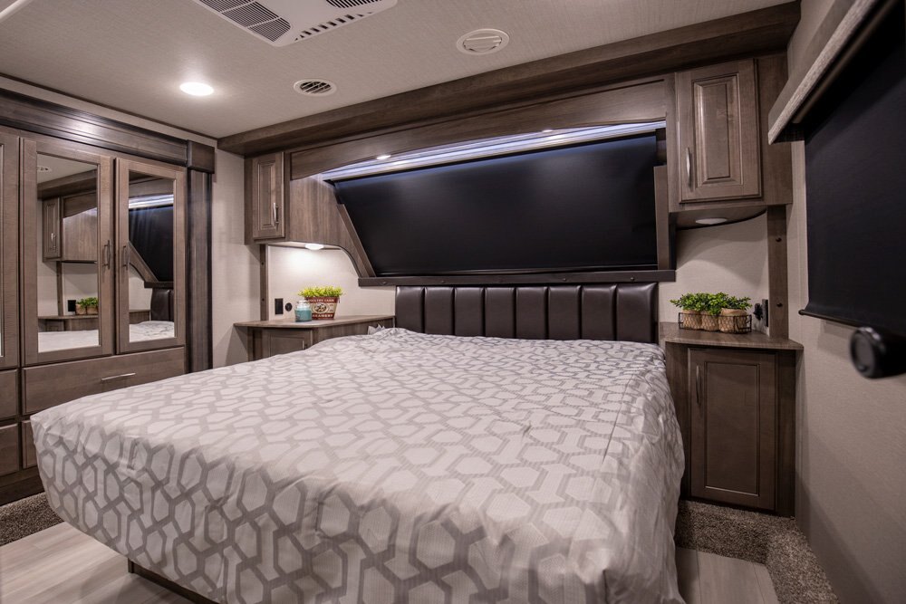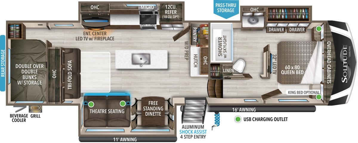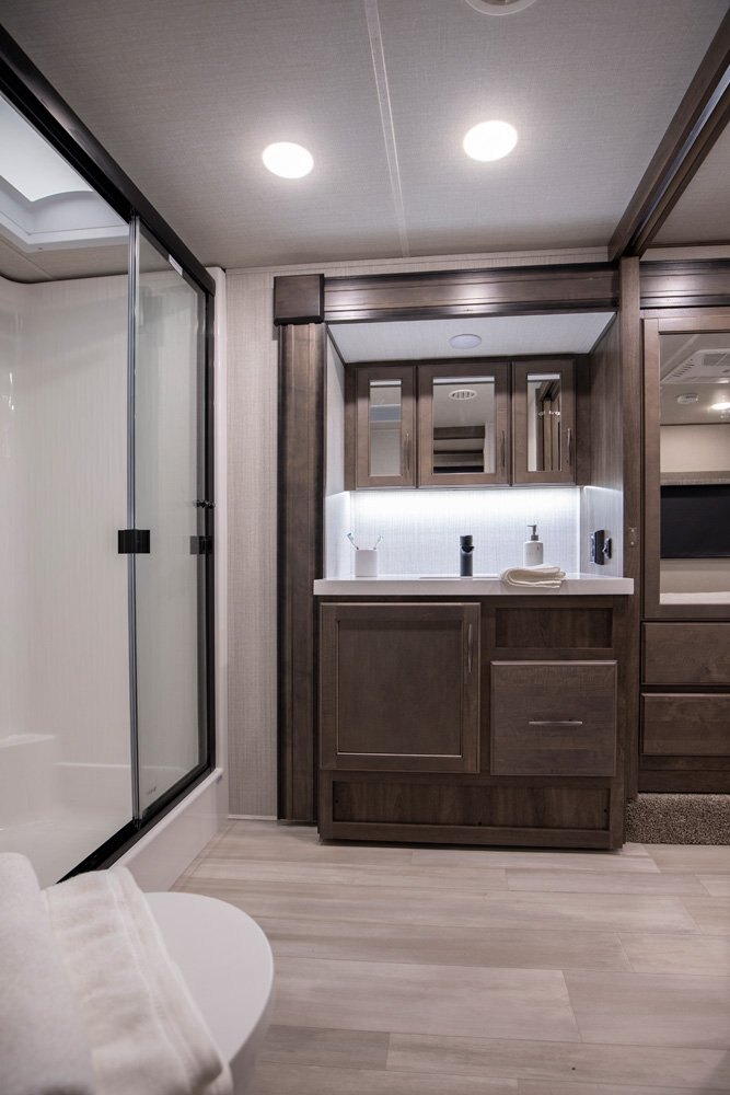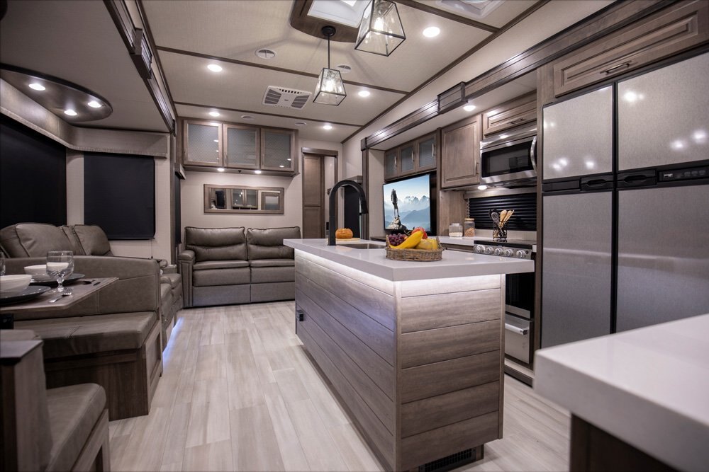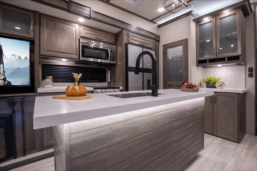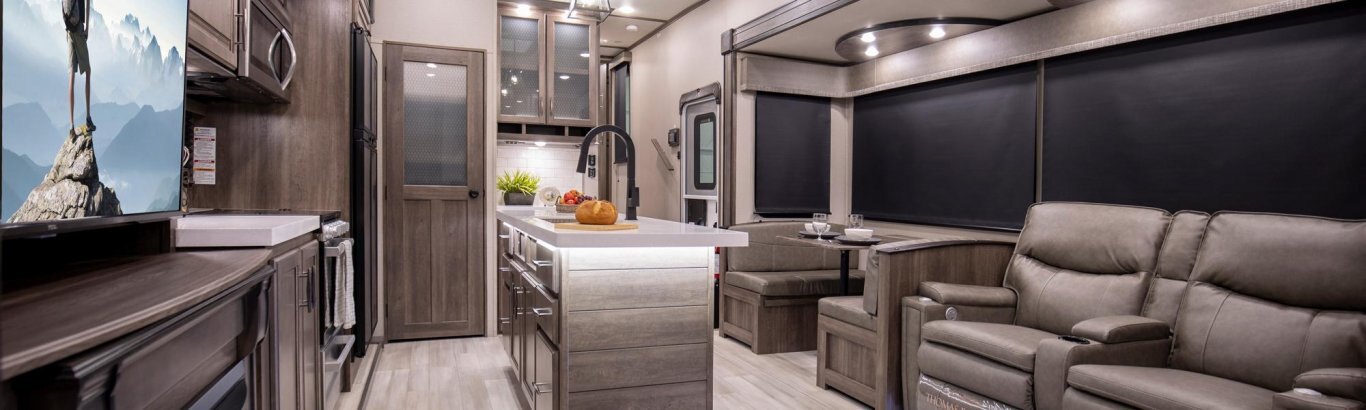 If more room is what you desire, Solitude is the most spacious Extended Stay Fifth Wheel ever built! The Solitude RV delivers taller ceilings, taller, deeper cabinets, larger scenic window areas, a full 6' 8" tall slideout, and a body width that measures a full 101 inches!