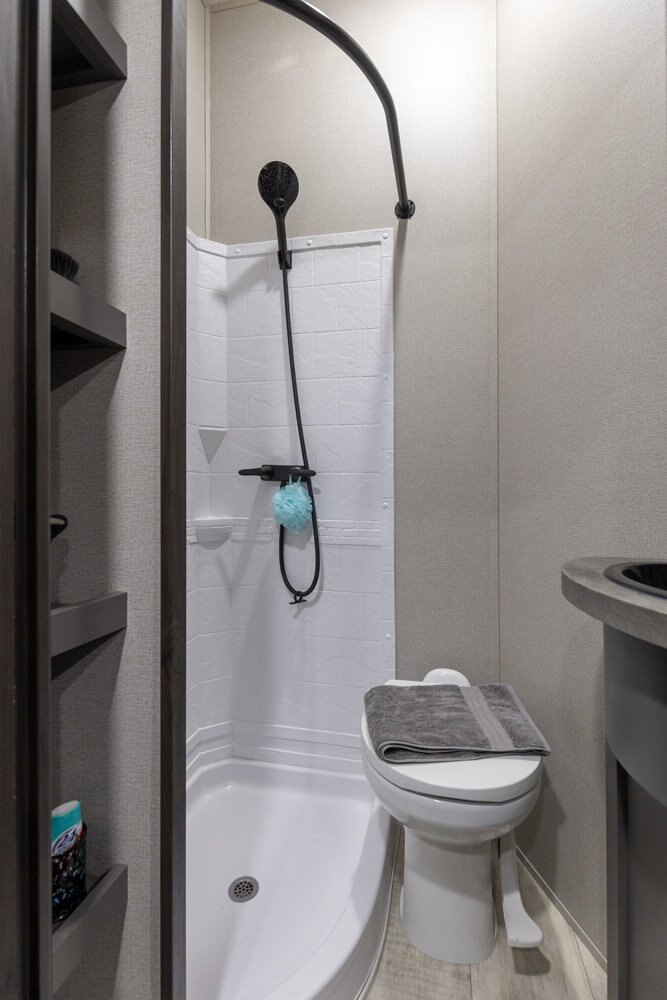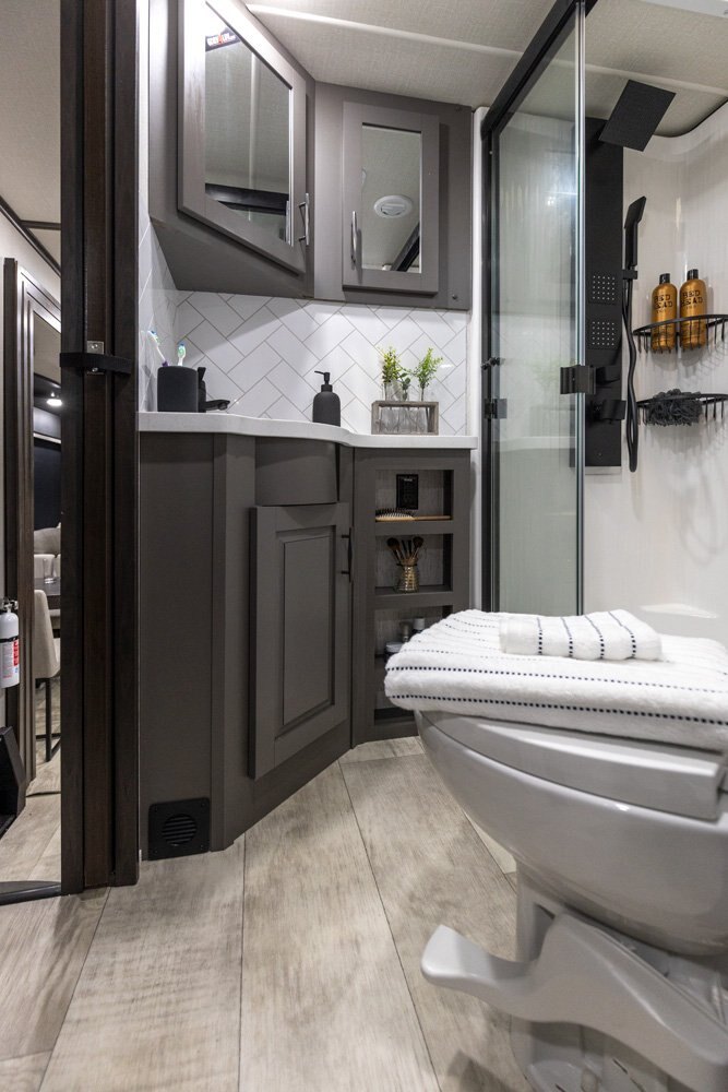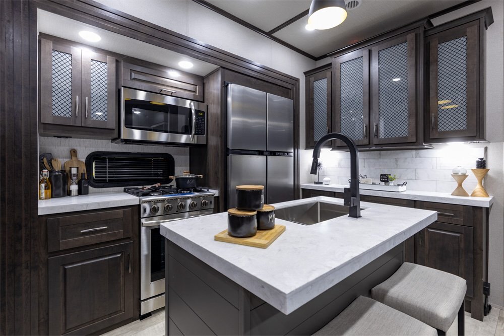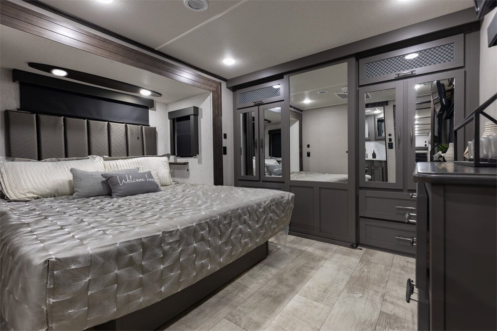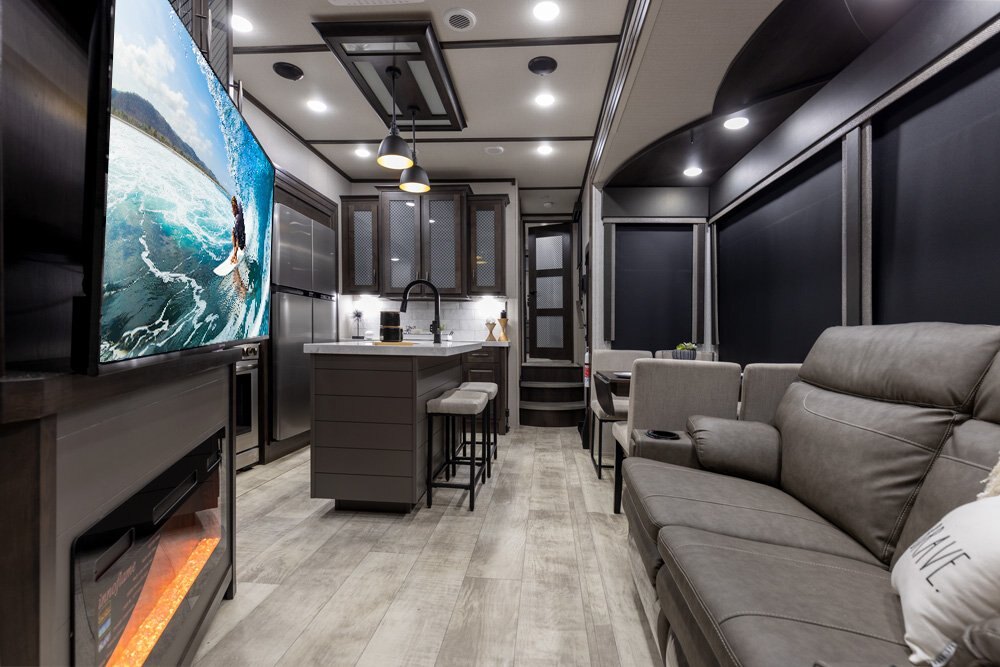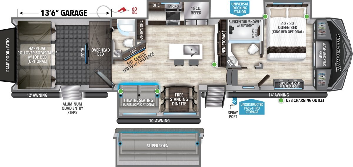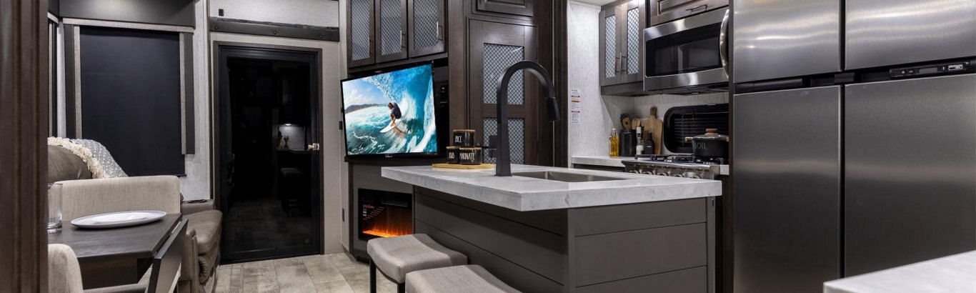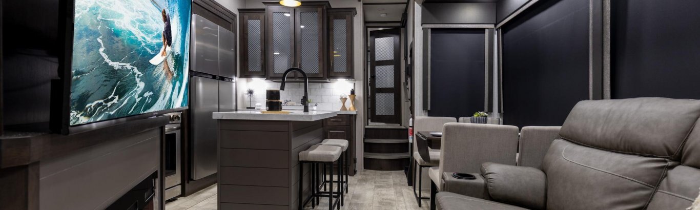 The Momentum Fifth Wheel Toy Hauler is the point where absolute luxury meets mobile garage! We have completely raised the Toy Hauler bar by incorporating an elegant Master Bath and Master Suite (with a full walk-in closet) into this unit! But trust us, we didn't ignore the Living and Garage areas. Check out our Floorplan Fly-Through Videos and get a feel for the extraordinary space we've created. We know you will agree with us when we say that "The Momentum RV is the place to live well and play hard!".
