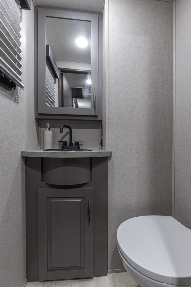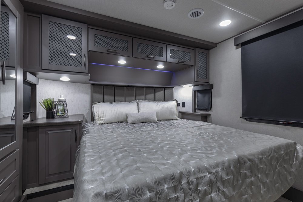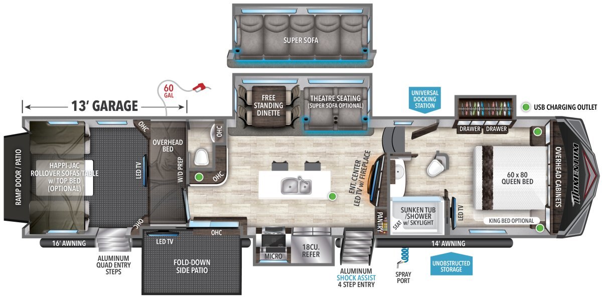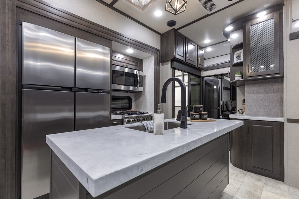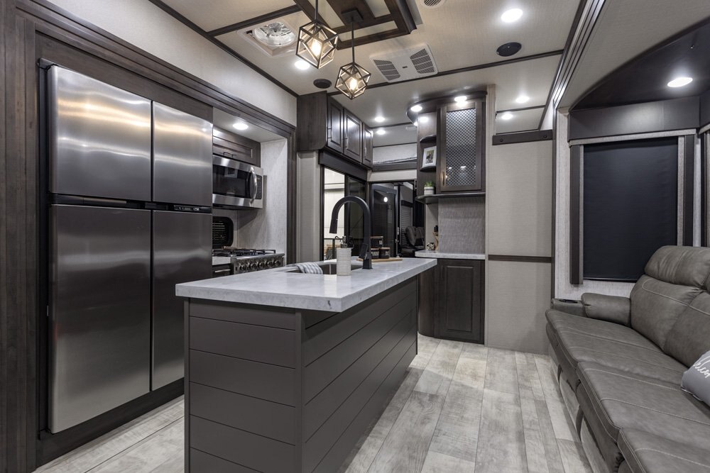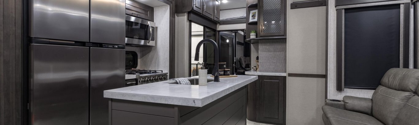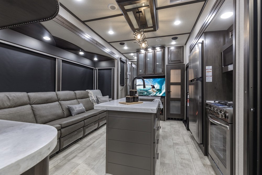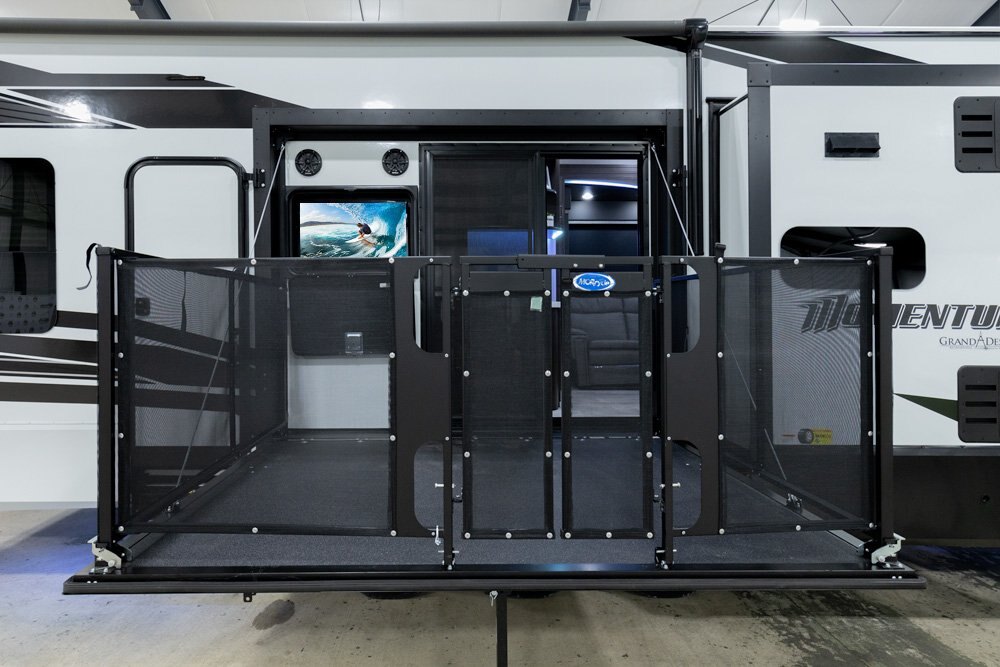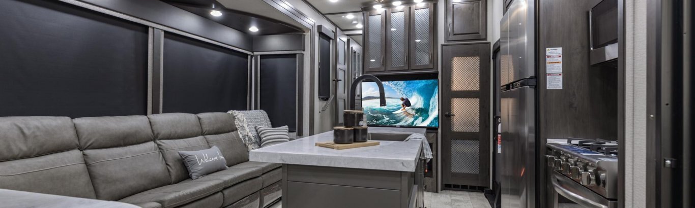 The Momentum Fifth Wheel Toy Hauler is the point where absolute luxury meets mobile garage! We have completely raised the Toy Hauler bar by incorporating an elegant Master Bath and Master Suite (with a full walk-in closet) into this unit! But trust us, we didn't ignore the Living and Garage areas. Check out our Floorplan Fly-Through Videos and get a feel for the extraordinary space we've created. We know you will agree with us when we say that "The Momentum RV is the place to live well and play hard!".