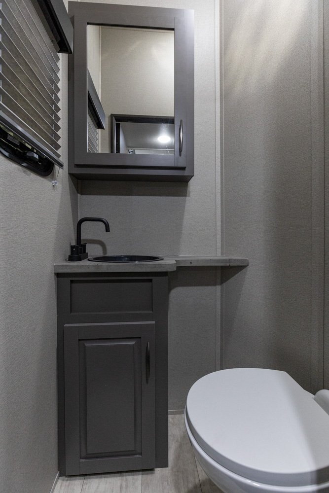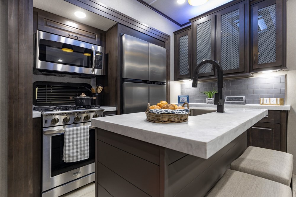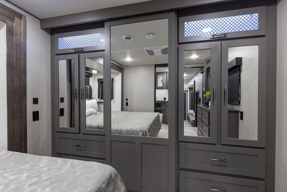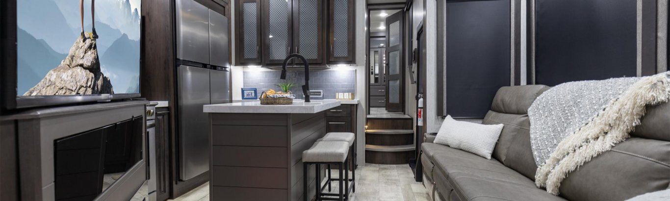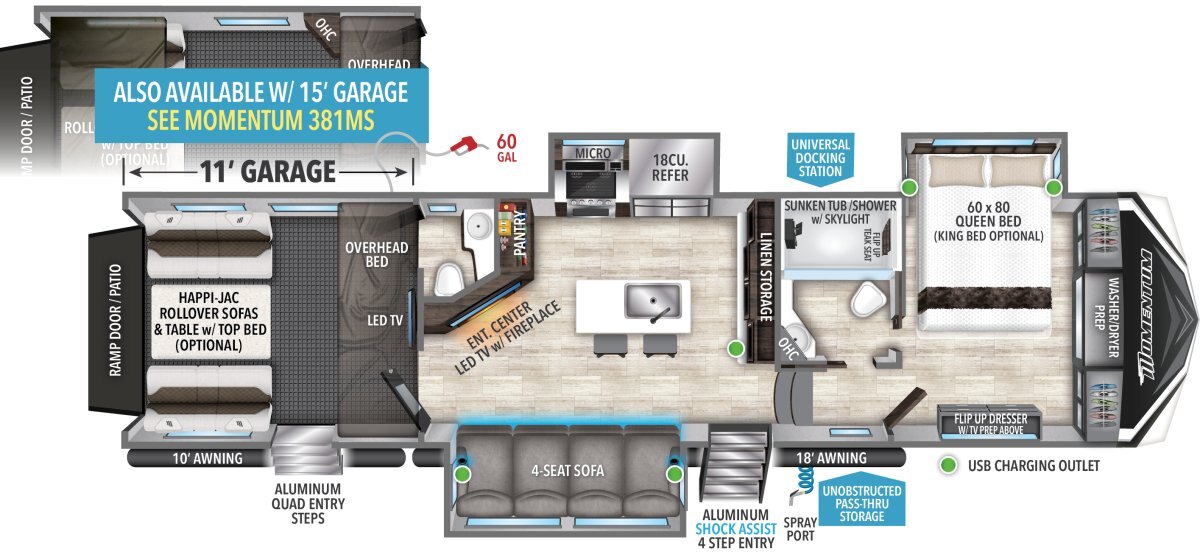 The Momentum Fifth Wheel Toy Hauler is the point where absolute luxury meets mobile garage! We have completely raised the Toy Hauler bar by incorporating an elegant Master Bath and Master Suite (with a full walk-in closet) into this unit! But trust us, we didn't ignore the Living and Garage areas. Check out our Floorplan Fly-Through Videos and get a feel for the extraordinary space we've created. We know you will agree with us when we say that "The Momentum RV is the place to live well and play hard!".