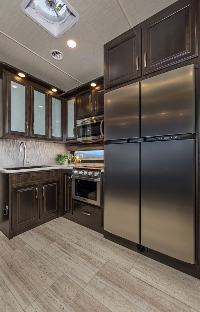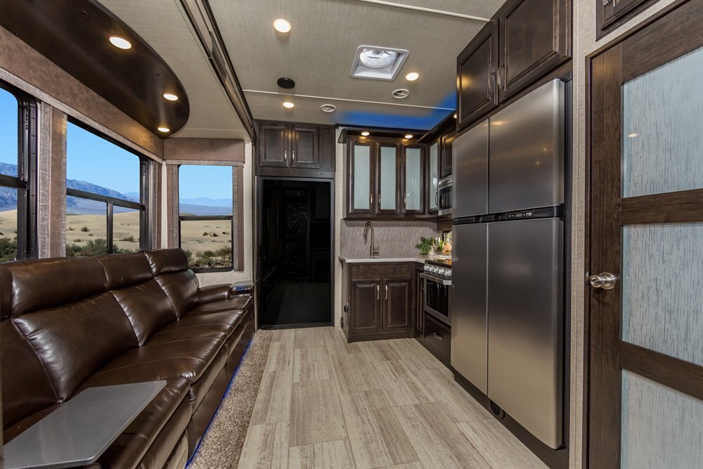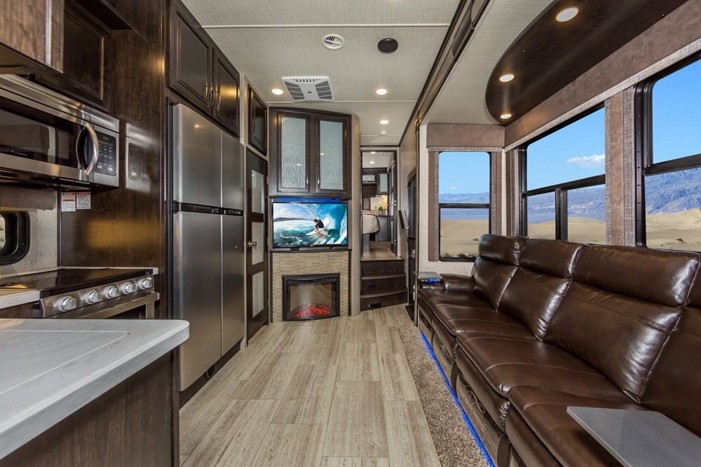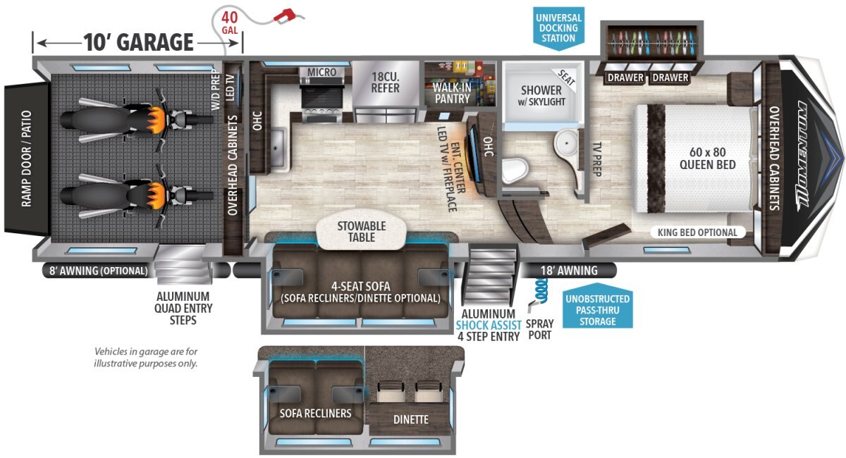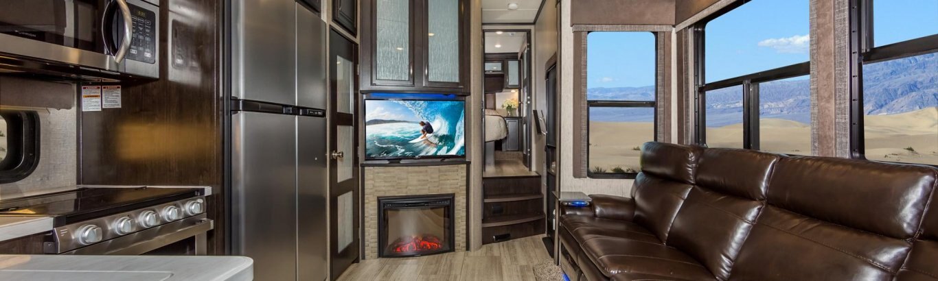 The Momentum Fifth Wheel Toy Hauler is the point where absolute luxury meets mobile garage! We have completely raised the Toy Hauler bar by incorporating an elegant Master Bath and Master Suite (with a full walk-in closet) into this unit! But trust us, we didn't ignore the Living and Garage areas. Check out our Floorplan Fly-Through Videos and get a feel for the extraordinary space we've created. We know you will agree with us when we say that "The Momentum RV is the place to live well and play hard!".