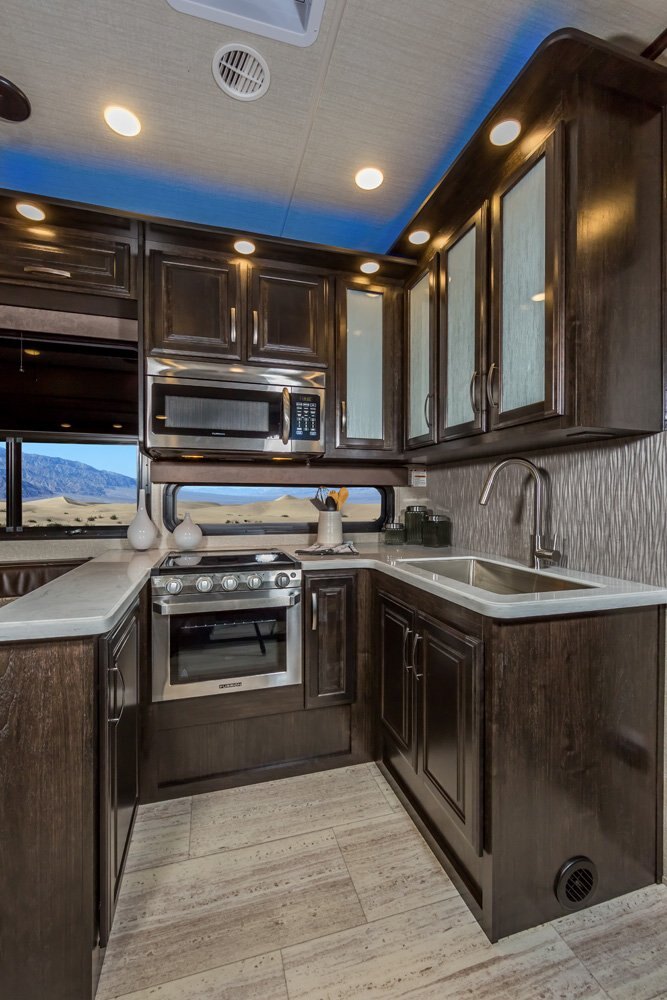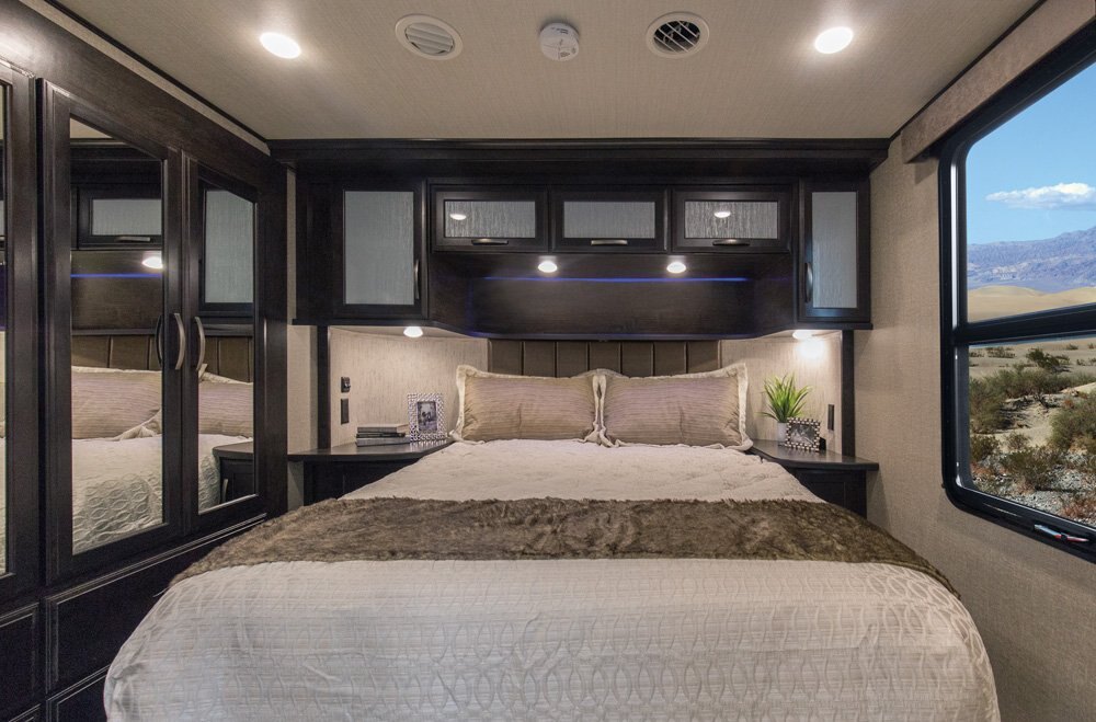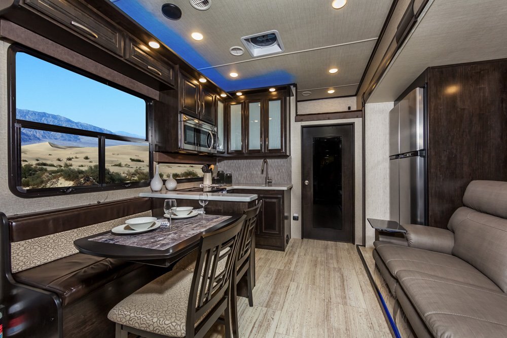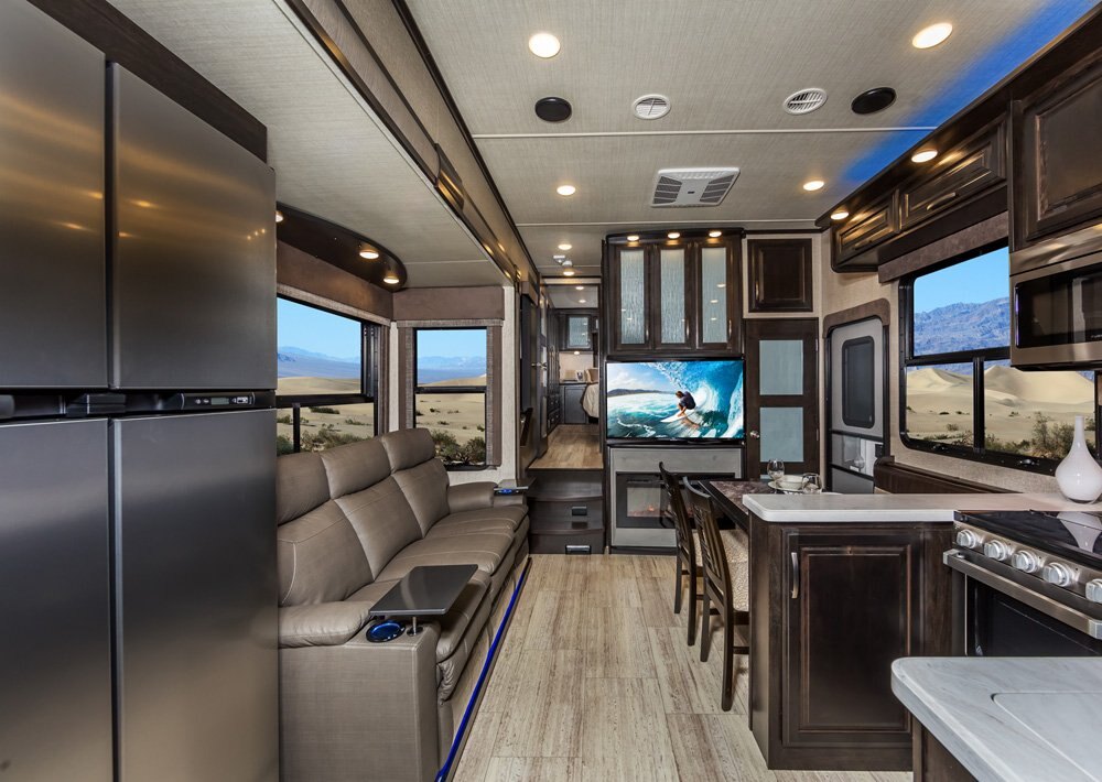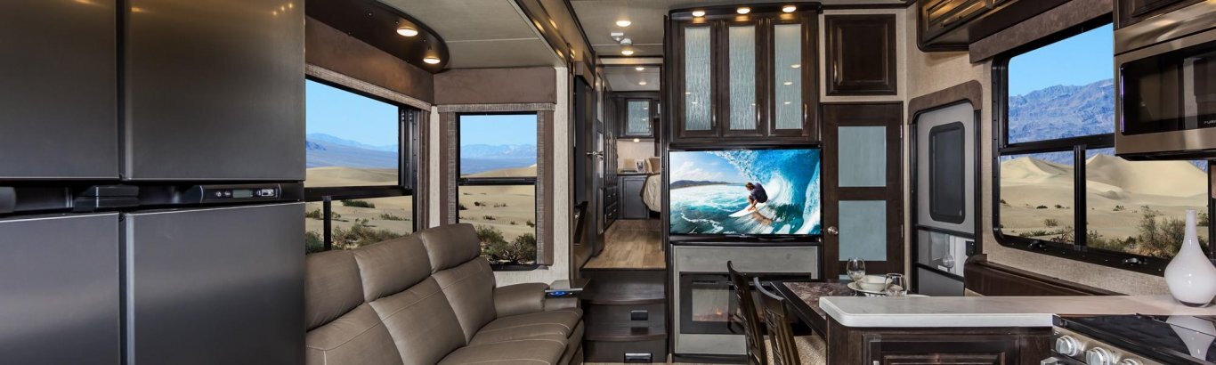 The Momentum Fifth Wheel Toy Hauler is the point where absolute luxury meets mobile garage! We have completely raised the Toy Hauler bar by incorporating an elegant Master Bath and Master Suite (with a full walk-in closet) into this unit! But trust us, we didn't ignore the Living and Garage areas. Check out our Floorplan Fly-Through Videos and get a feel for the extraordinary space we've created. We know you will agree with us when we say that "The Momentum RV is the place to live well and play hard!".