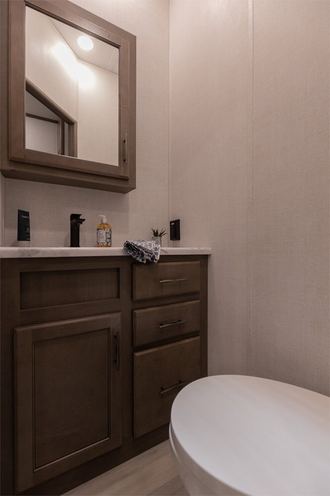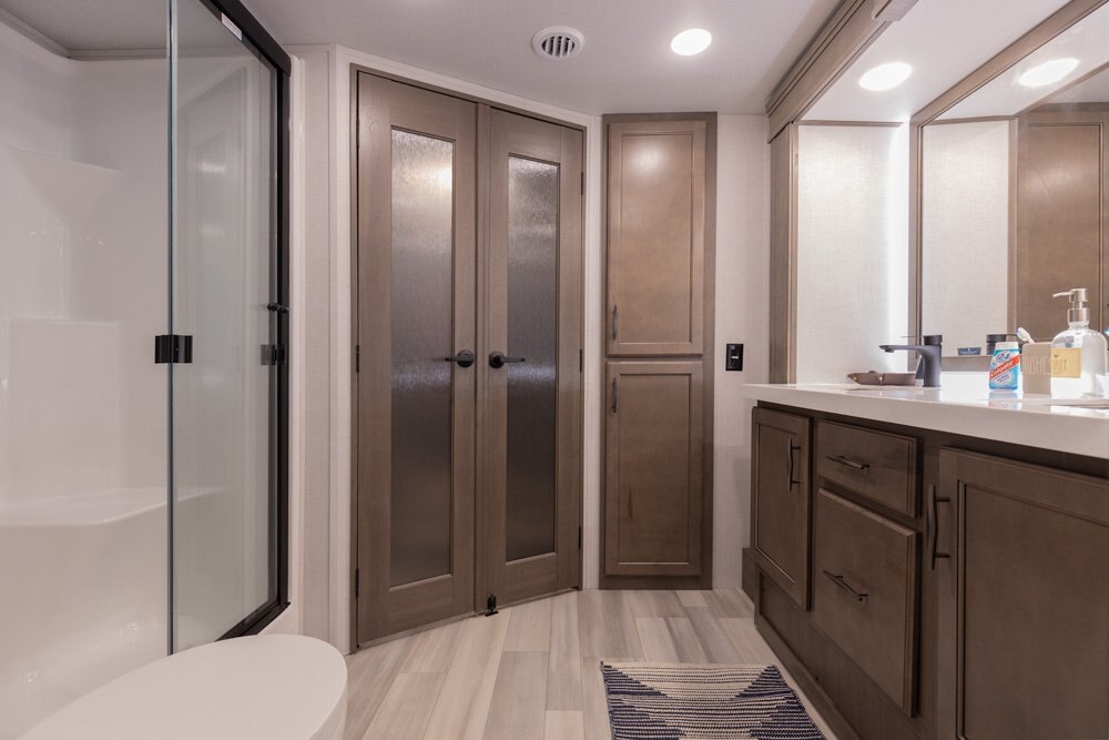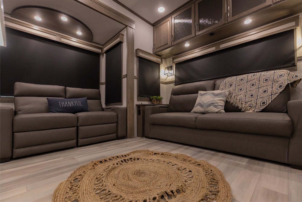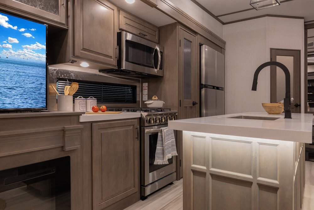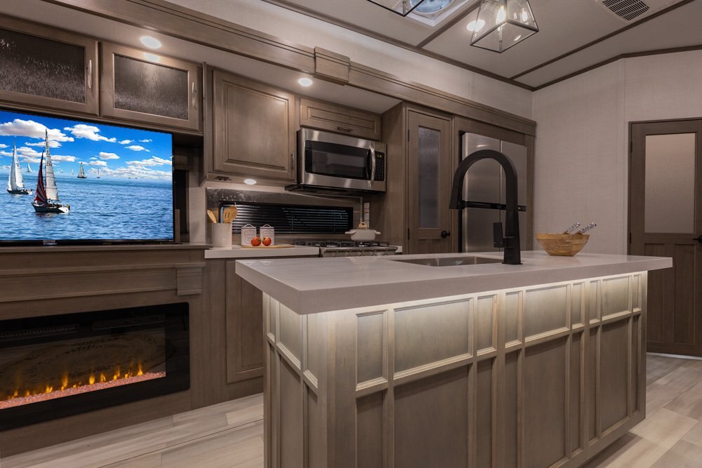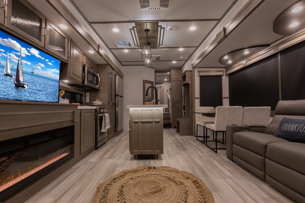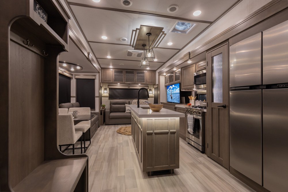 If more room is what you desire, Solitude is the most spacious Extended Stay Fifth Wheel ever built! The Solitude RV delivers taller ceilings, taller, deeper cabinets, larger scenic window areas, a full 6' 8" tall slideout, and a body width that measures a full 101 inches!