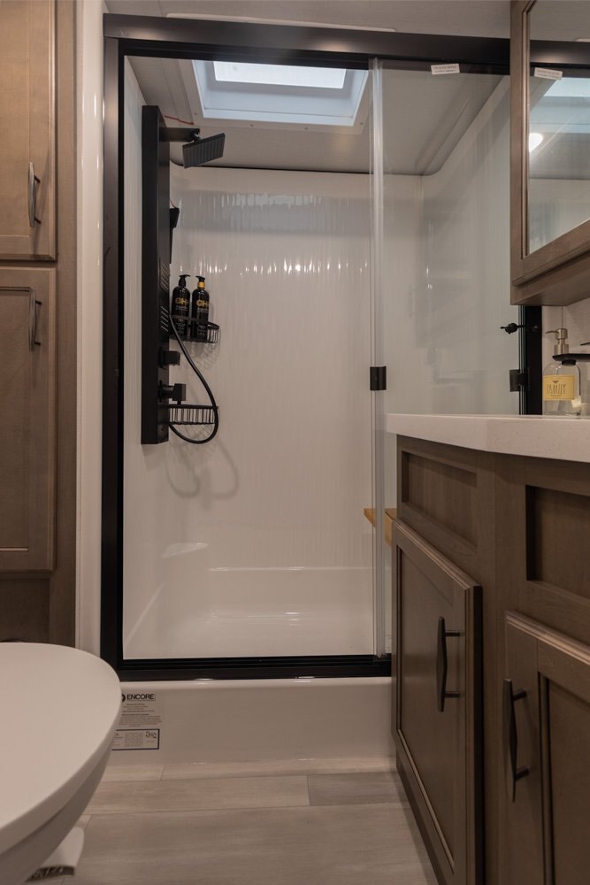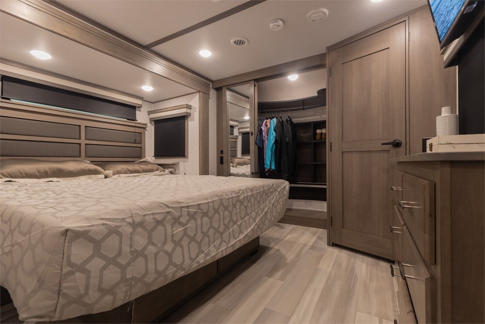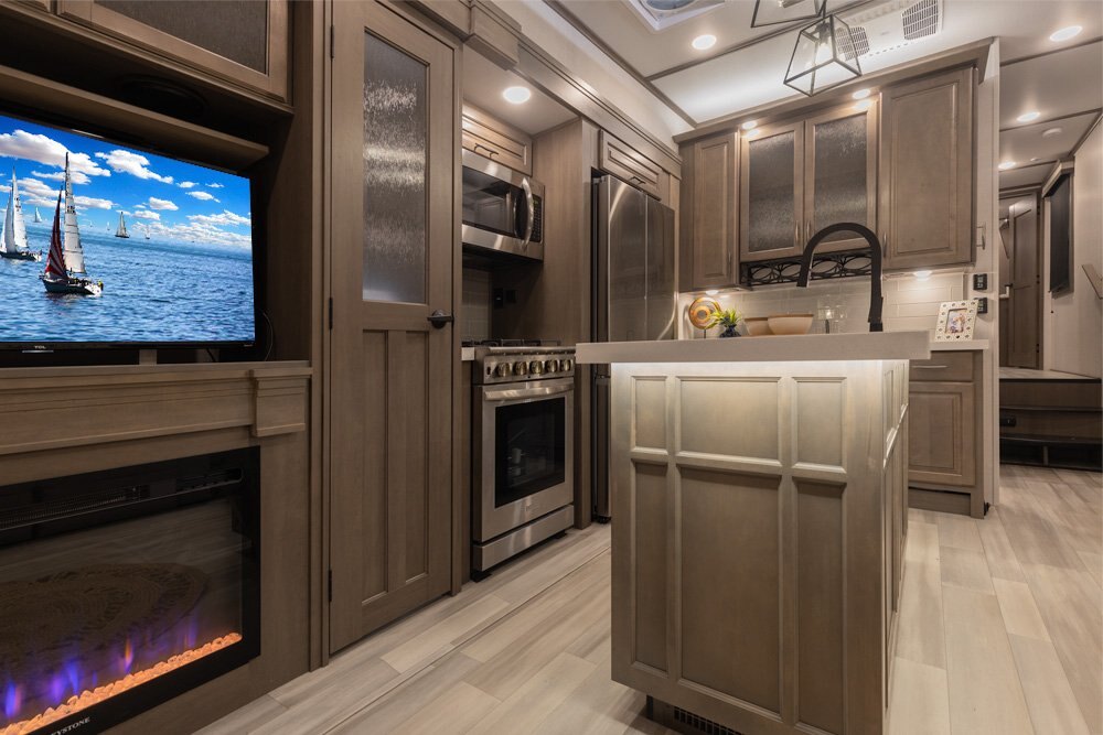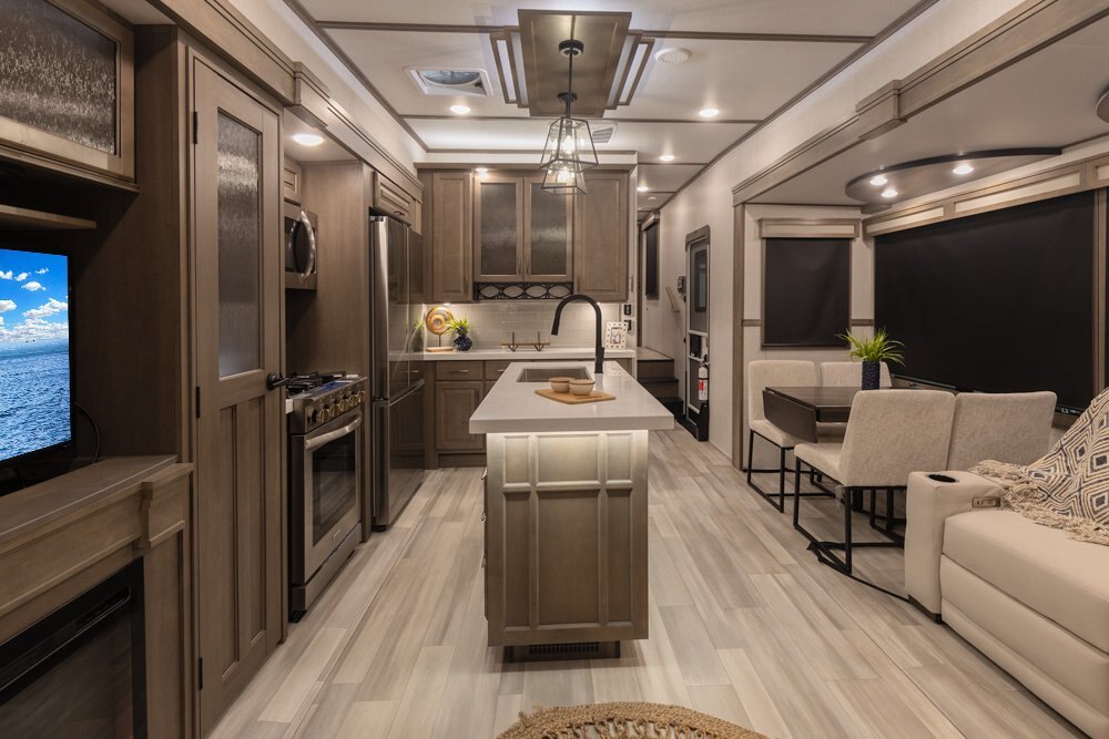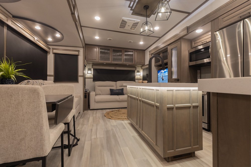 If more room is what you desire, Solitude is the most spacious Extended Stay Fifth Wheel ever built! The Solitude RV delivers taller ceilings, taller, deeper cabinets, larger scenic window areas, a full 6' 8" tall slideout, and a body width that measures a full 101 inches!