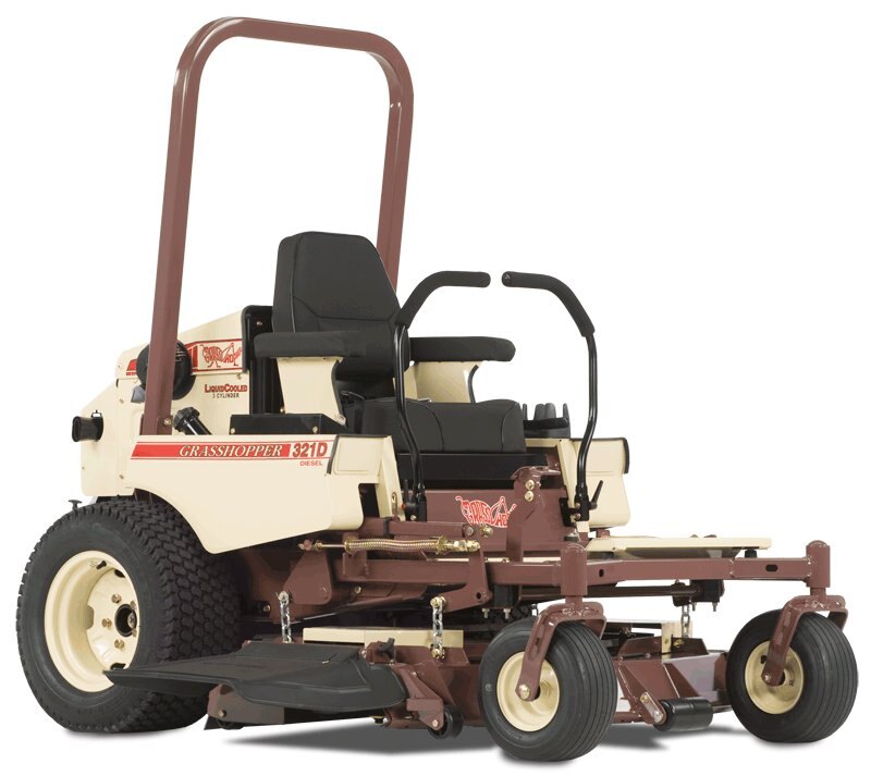 | The diesel-powered Grasshopper Model 321D is built to last. The fuel-efficient diesel engine has the torque to handle any job with the greatest of ease. Rural home owners and commercial landscapers can take advantage of the fuel efficiency of diesel as well as the legendary Grasshopper comfort, durability, quality and easy maintenance built into this zero-turning mid-mount mower. |
