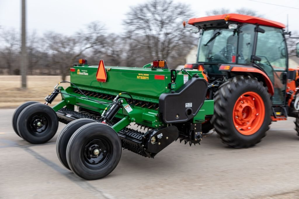 Product Description 7', 9', & 11' Seeders The NTS25 and NTS26 Series No-Till Seeder, available in 7', 9', and 11' widths, makes quick work of renovating pastures, reclaiming rights-of-way, and planting food plots. Designed with ease of use in mind, the NTS25 and NTS26 Series Seeder comes with a variety of built-in features. Metering is ground-driven by the rear packer-roller. Any of the seed boxes can easily be disengaged with simple lockout pins on each drive sprocket, or all the boxes can be locked out with one pin on the main sprocket. This American-made seeder comes standard with a main and small seeds box, with an optional factory-installed native grass (or fluffy) seed box available. The NTS is offered as a 3-point model or pull-type model with transport wheels. The main seed meters are set by adjusting sprocket transmission and the seed cup flutes with the seed-rate regulator. The small seeds meters are set by adjusting the seed cup flutes with the seed-rate regulator. The optional native grass meter is set with a 4-speed gearbox and sprocket transmission (NTS25 Series) or a 3-speed transmission (NTS26 Series). The NTS’s tillage aggressiveness is controlled by angling the front spiked rollers. Protected by a metal wind shield, seed is directed to the ground below and gently pressed into the soil with the rear cast packer. An optional acremeter keeps track of acres planted. |