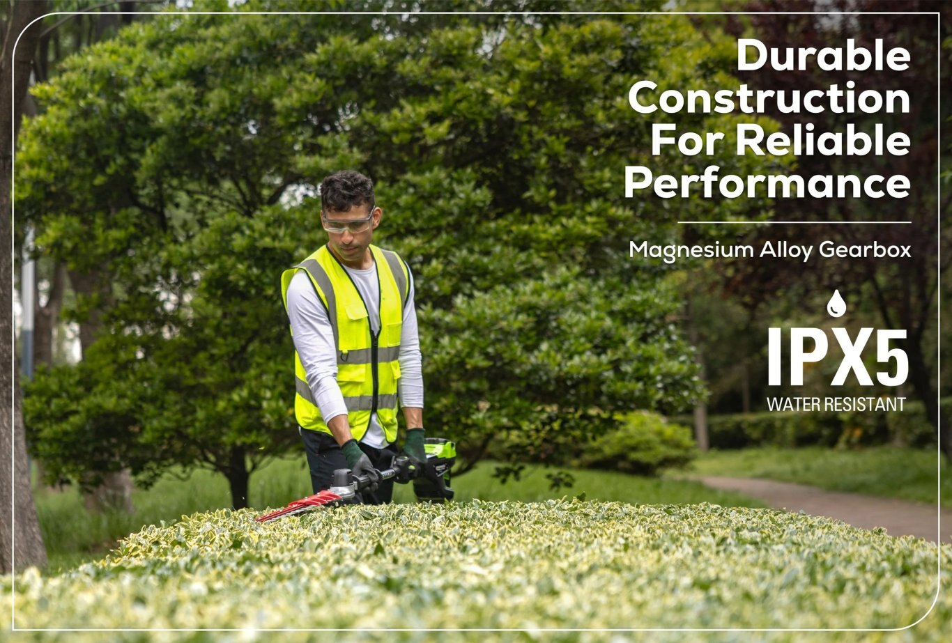 Our trimmer features a commercial-grade magnesium alloy gearbox, ensuring durability and consistent performance even in the toughest conditions. With an IPX5 waterproof rating, it’s can withstand water jets from any direction, providing peace of mind and longevity. |