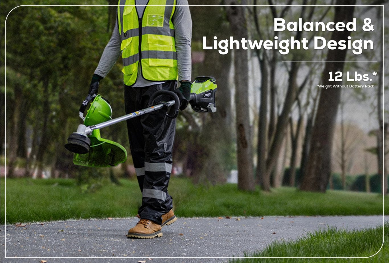 Weighing in at 11.9 lbs. tool only and 16.6 lbs. with the recommended 4ah battery, this trimmer is easy to carry and operate for all day trimming performance. |