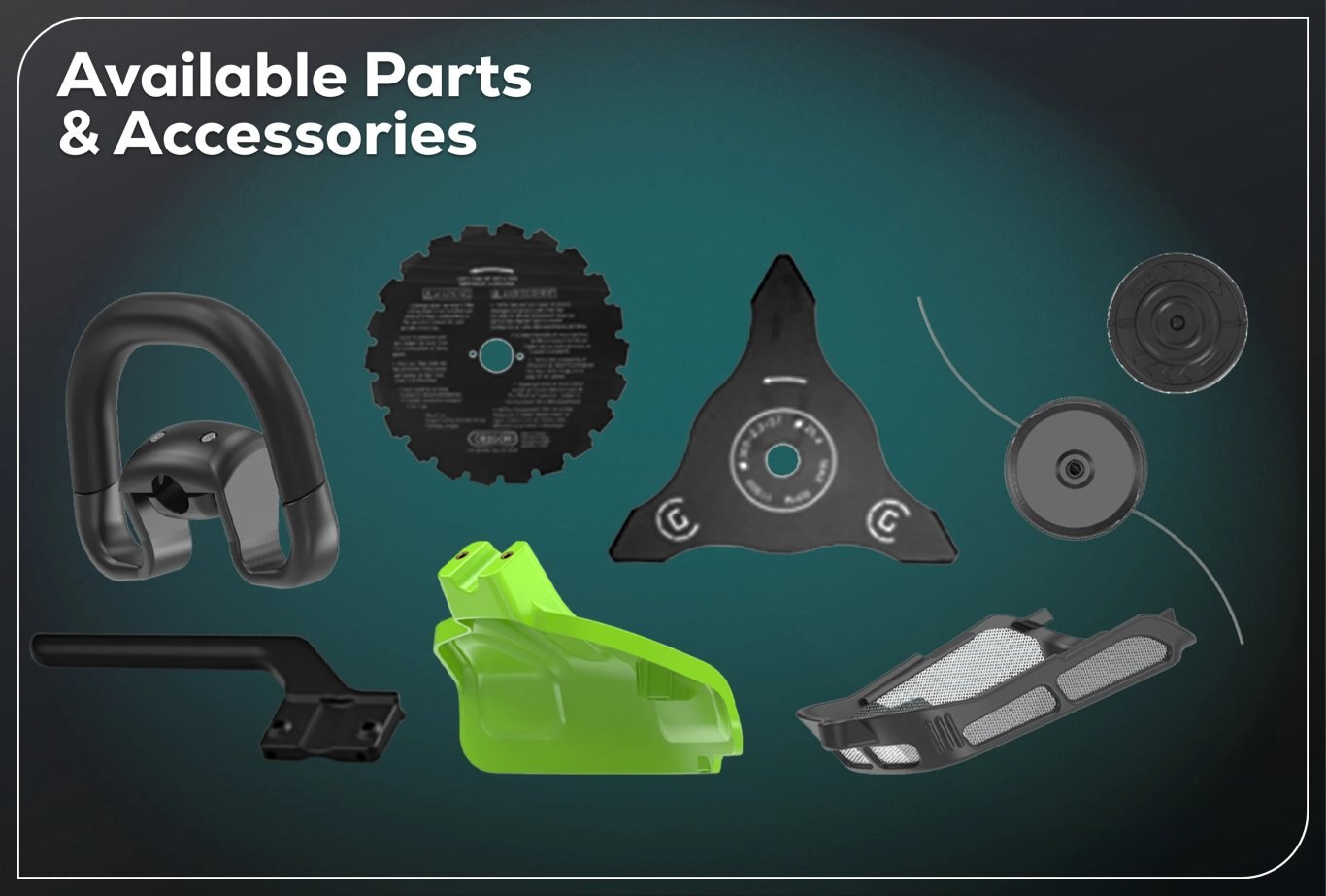 Compatible with a variety of trimmer heads, trimmer lines, brush blades and trimmer/brush guards, straps, grease, spool covers, auxiliary handles, air intakes, batteries, and barrier bars. |