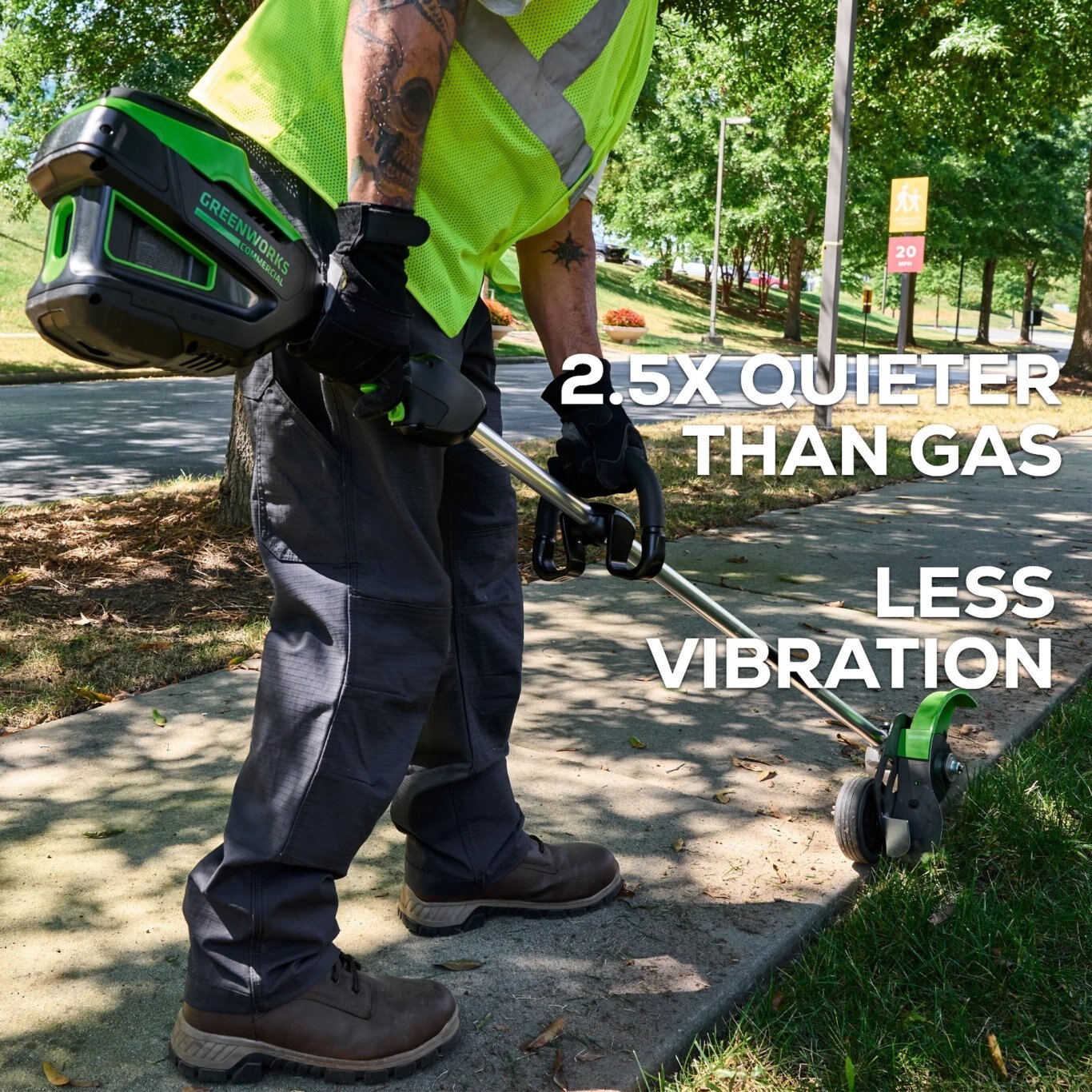SUPERIOR DESIGNLightweight at only 16.35 lbs. operating weight. The Greenworks Brushless Motor makes this trimmer 7x quieter than comparable gas units- 62 dB (50 ft) vs. 74 dB (at operator's ear). Quieter tools mean you can gain more business by starting earlier or working later in the day. Less than 2.3 m/s"2 of vibration- low vibration causes less user fatigue, allowing you to cut more comfortably for longer. |