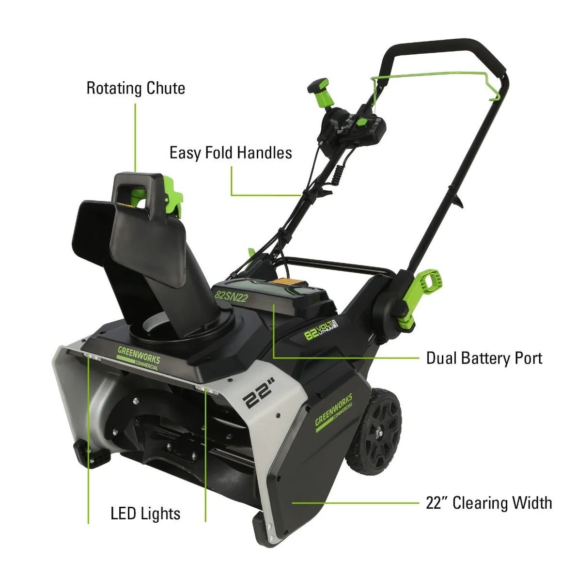 CONQUER WINTER WITH EASEMaster the toughest snowfalls with the 82V Brushless 22" Dual Port Snow Thrower by Greenworks® Commercial. This electric beast cuts through the competition, offering a simpler, more user-friendly experience. This innovative snow blower ignites with a single push, empowering you to focus on clearing snow, not wrestling with your equipment.