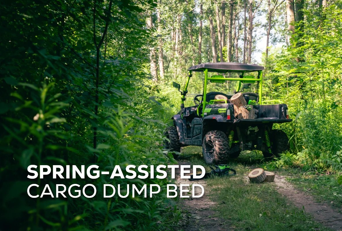 Spring-Assisted Cargo Dump Bed: Carry up to 550 lbs in the 32x42x12" cargo bed