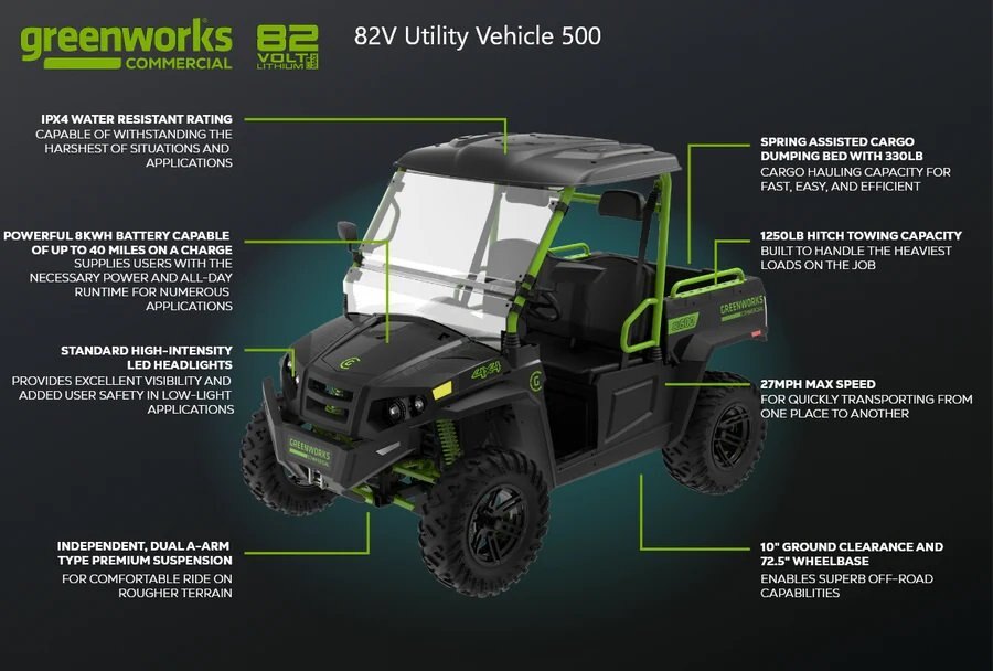 SERIOUS POWER, SIMPLE OPERATIONEnhance your utility experience with the 82V 500 Series Electric Utility Vehicle, featuring Greenworks® Commercial’s powerful 8kWh max gTRON Drive™ System. This high-performance electric UTV matches a 22 HP gas engine and has an intelligent control system that ensures a smooth operation on diverse terrains while offering exceptional traction control thanks to a 4WD propulsion. Choose efficiency, power, and simplicity with the smarter 82V electric utility vehicle. With the U500SB, you can expect: