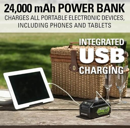 The Greenworks 24V lithium-ion platform powers over 50 indoor and outdoor products, including lawn mowers, blowers, string trimmers, chainsaws, power tools, and more! The 24V lithium-ion battery provides 20% more power and 35% more run-time, and delivers fade-free power with no memory loss after charging. The outdoor power equipment allows you to tackle up to 1/4 acre with the available 1.5Ah, 2Ah, and 4Ah batteries. USB ports are integrated into the BAG711, BAG708, and BAG709 batteries, making it a portable charger for phones, tablets, and other compatible electronic accessories. The Greenworks 24V platform comes with a 3 year tool / battery warranty to protect your investment.