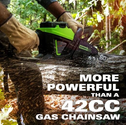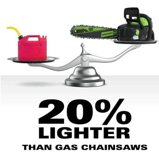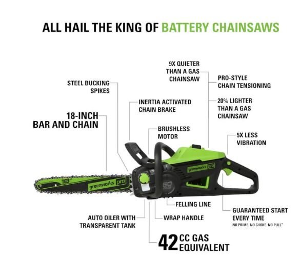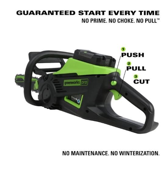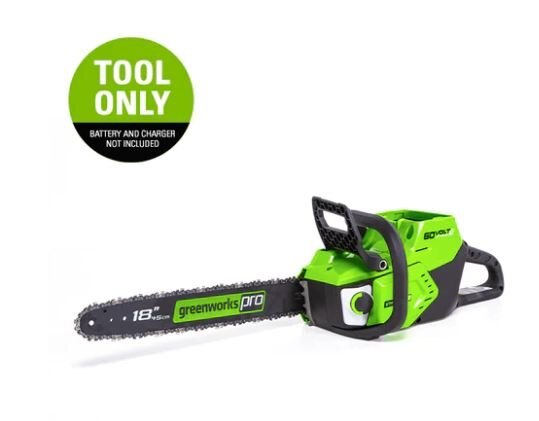 Powered by a Greenworks Pro 60V lithium-ion battery (battery & charger sold separately), this Greenworks Pro cordless chainsaw is the ideal choice for homeowners who want the convenience and benefits of going cordless for everyday yard work but also the confidence to take on occasionally challenging projects, without the noise, fumes, or harmful emissions. The powerful Greenworks Pro 60V cordless battery platform gives you all the power you need to tackle all your lawn care projects. Kick gas to the curb this spring and go green with no fumes, no mixing, no maintenance and no pull cords. Let Greenworks help you take the work out of yard work.