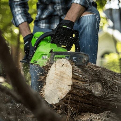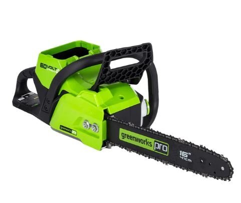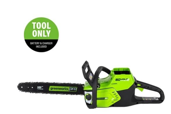 Powered by a Greenworks Pro 60V lithium-ion battery (battery & charger sold separately), this Greenworks Pro cordless chainsaw is the ideal choice for homeowners who want the convenience and benefits of going cordless for everyday yard work but also the confidence to take on occasionally challenging projects, without the noise, fumes, or harmful emissions. The powerful Greenworks Pro 60V cordless battery platform gives you all the power you need to tackle all your lawn care projects. Kick gas to the curb this spring and go green with no fumes, no mixing, no maintenance and no pull cords. Let Greenworks help you take the work out of yard work.