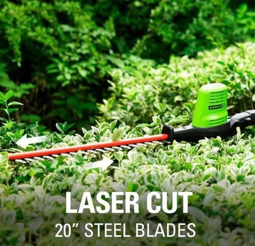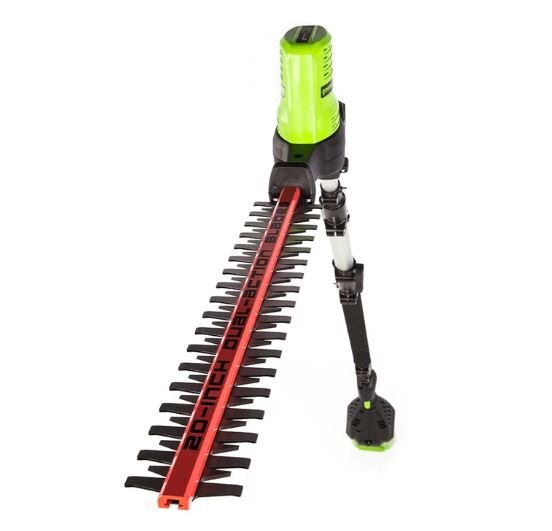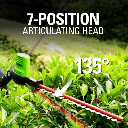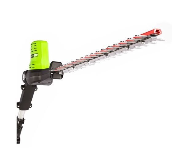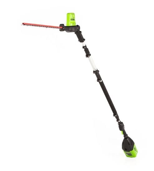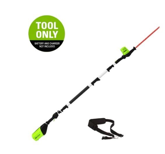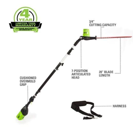 The Greenworks pro 80 volt 20-inch pole hedge trimmer features dual action blades, pivoting head, 3/4-Inch cutting capacity, and cushioned overmold grip. When it comes to outdoor power equipment, you put the emphasis on “power.” And why not? For homeowners like you who take on jobs big or small, you need heavy grade construction and long-lasting peak performance. The Greenworks Pro 80V family of tools meet the challenge with a universal battery system that works across multiple products, high-efficiency motors, and innovative smart technology. All Greenworks Pro 80V tools feature a 4 Year Limited Tool & Battery Warranty.