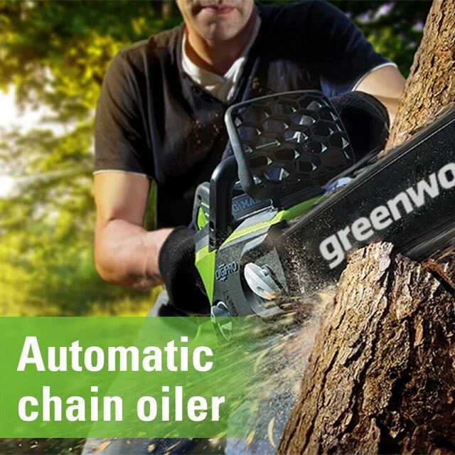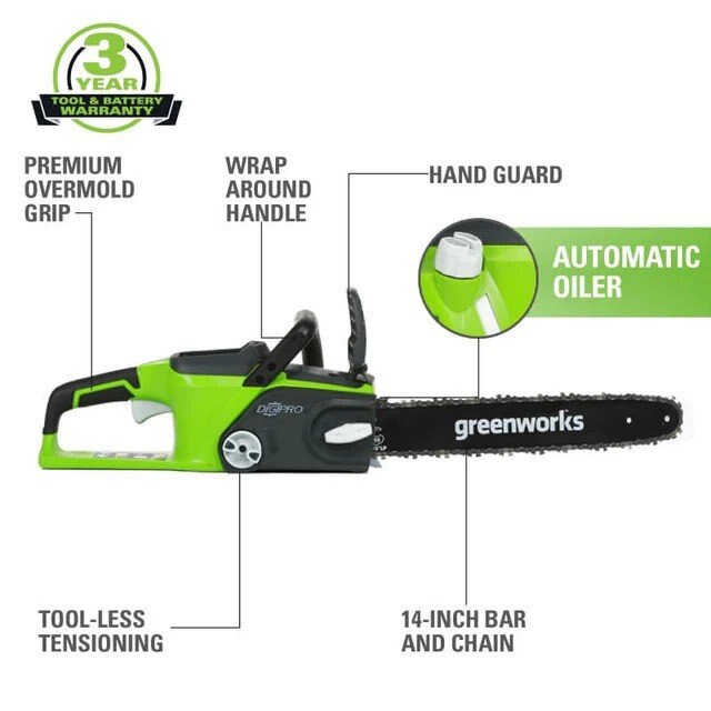 Greenworks 40V system offers a wide range of easy-to-use tools for the homeowner and those who just want more power. This 14-inch cordless chainsaw features a high speed brushless motor that delivers superior power and performance. This unit is light weight, has an automatic oiler with oil view window and side access tensioning. The 14-inch bar and chain is suitable for medium to heavy duty applications.