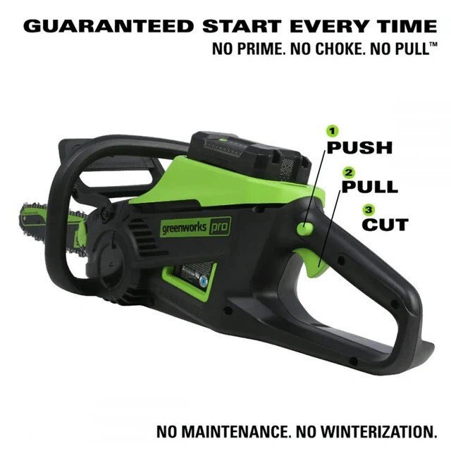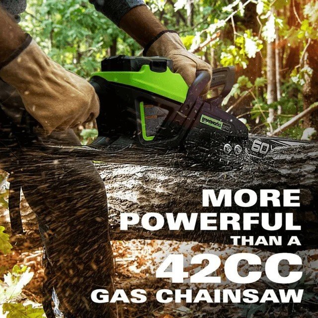 Powered by a pro-grade 60-volt lithium-ion battery, the new Greenworks battery-powered chainsaw delivers the power and performance of typical gas-powered saws, without the noise, fumes, or harmful emissions. The battery-powered brushless motor delivers 20% more torque and faster cutting than a 42cc gas-powered chainsaw, and it features our No Prime, No Choke, No Pull: easy-starting system for fast starts every time, with no aggravating pull cord. This lightweight chainsaw is equipped with a 18-Inch bar and chain, pro-style side-mounted chain tensioning for easy bar and chain maintenance, automatic chain oiler, transparent oil fill window, and inertia-activated chain brake.