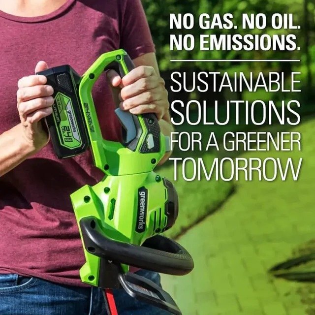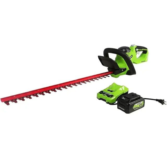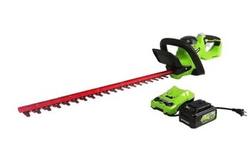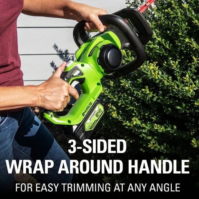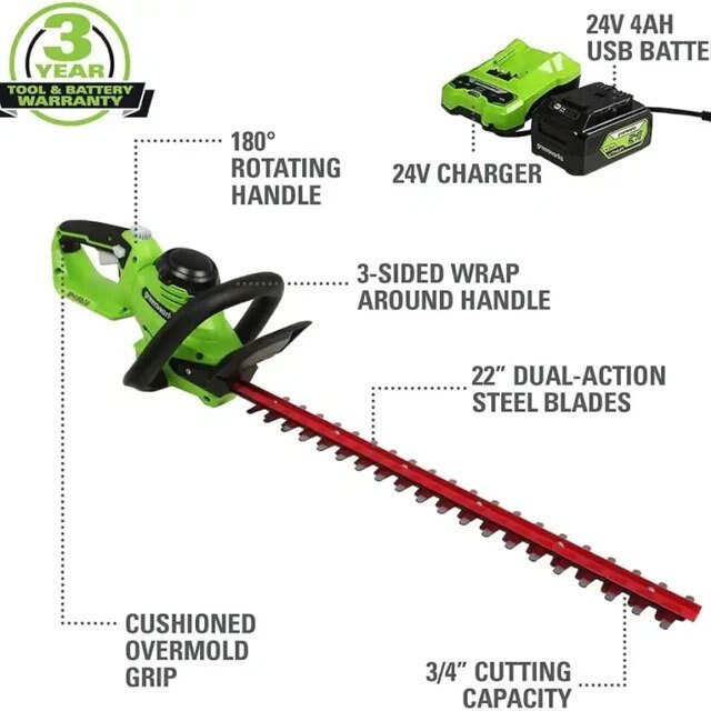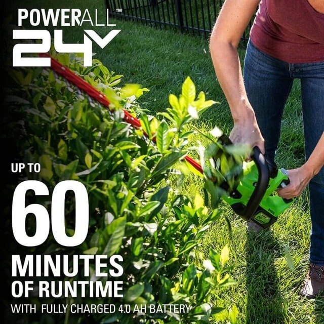 The 24V 22” Hedge Trimmer features heavy-duty 22” dual-action, laser-cut, steel blades for optimal performance and professional results. It is designed with a ¾” cutting capacity that cuts through thick branches with ease. The ergonomic rotating rear handle allows for greater flexibility when trimming the sides of hedges and lets you trim from multiple angles. The Greenworks 24V POWERALL™ platform comes with a 3 Year Limited Tool to protect your investment.