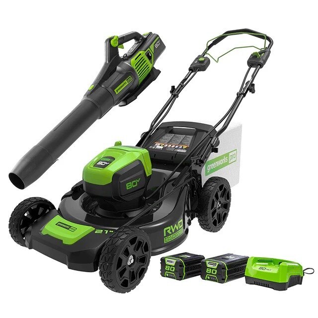 Greenworks 80V 21" Self-Propelled Mower and Axial Blower, 2.0 Ah & 4.0Ah Battery and Charger 1300241COVT Included